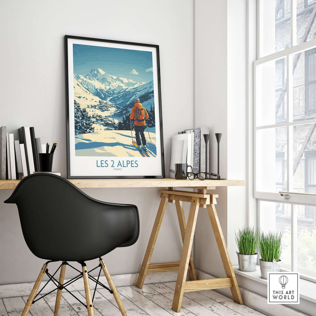 Les 2 Alpes poster displayed in a modern office, showcasing stunning mountain views and a skier against a vibrant backdrop.