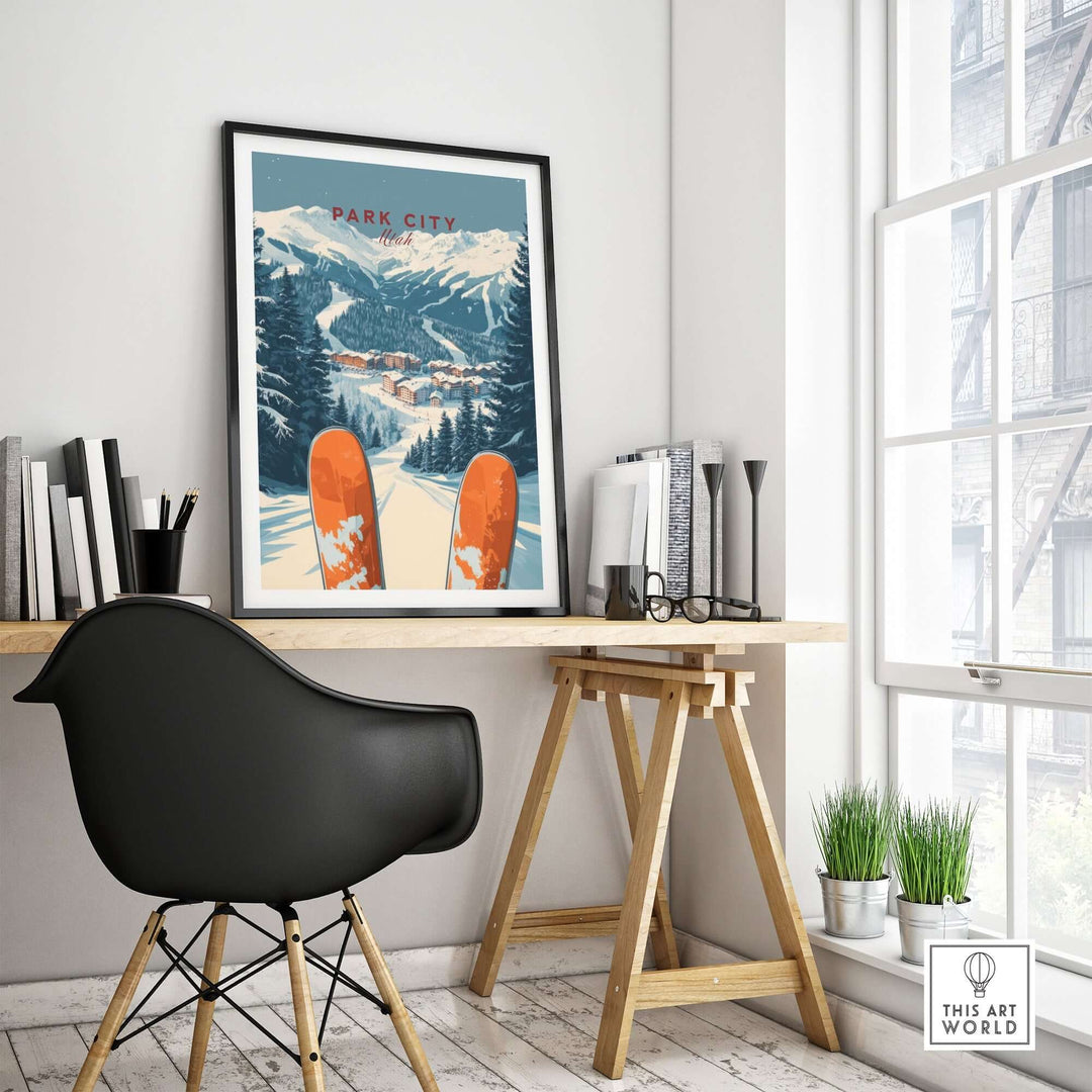Park City Ski Print featuring vibrant slopes, mountain views, and framed artwork ideal for home or office decor.