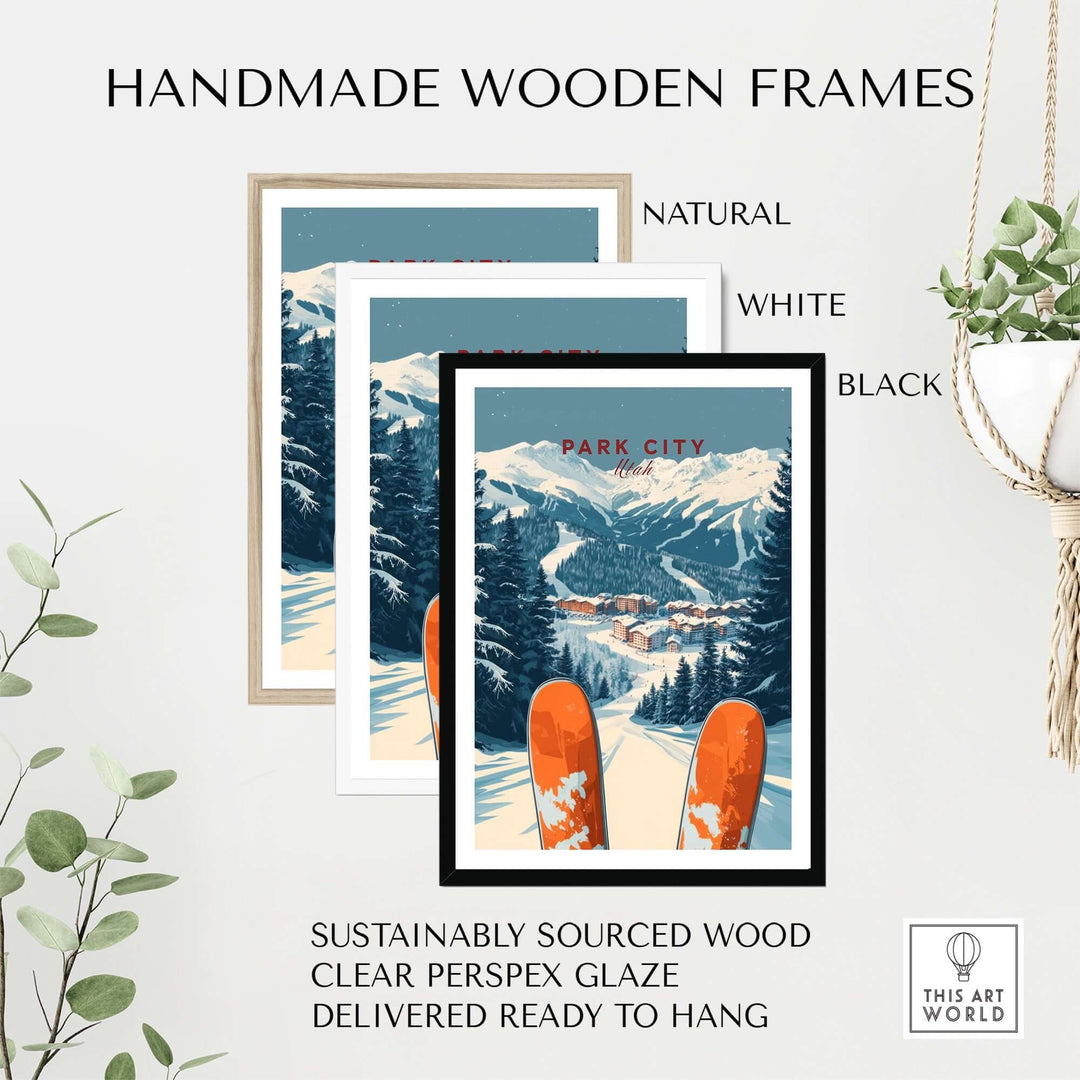 Handmade wooden frames in natural, white, and black styles showcasing Park City ski print, sustainably sourced and ready to hang.