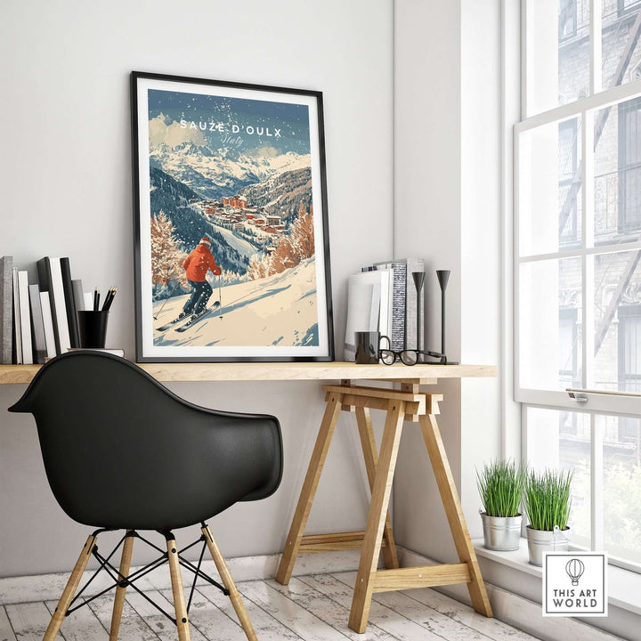 Ski print of Sauze d'Oulx, Italy, displayed in a stylish interior, perfect for ski enthusiasts.