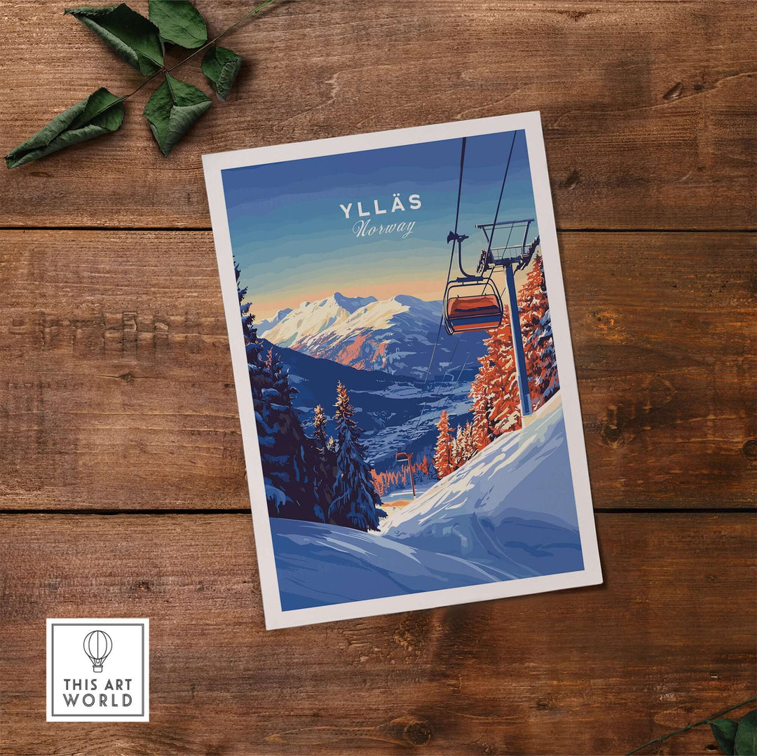 Ylläs Ski Lift poster framed on a wooden table, showcasing Norway's stunning mountains and ski lift in winter art style.