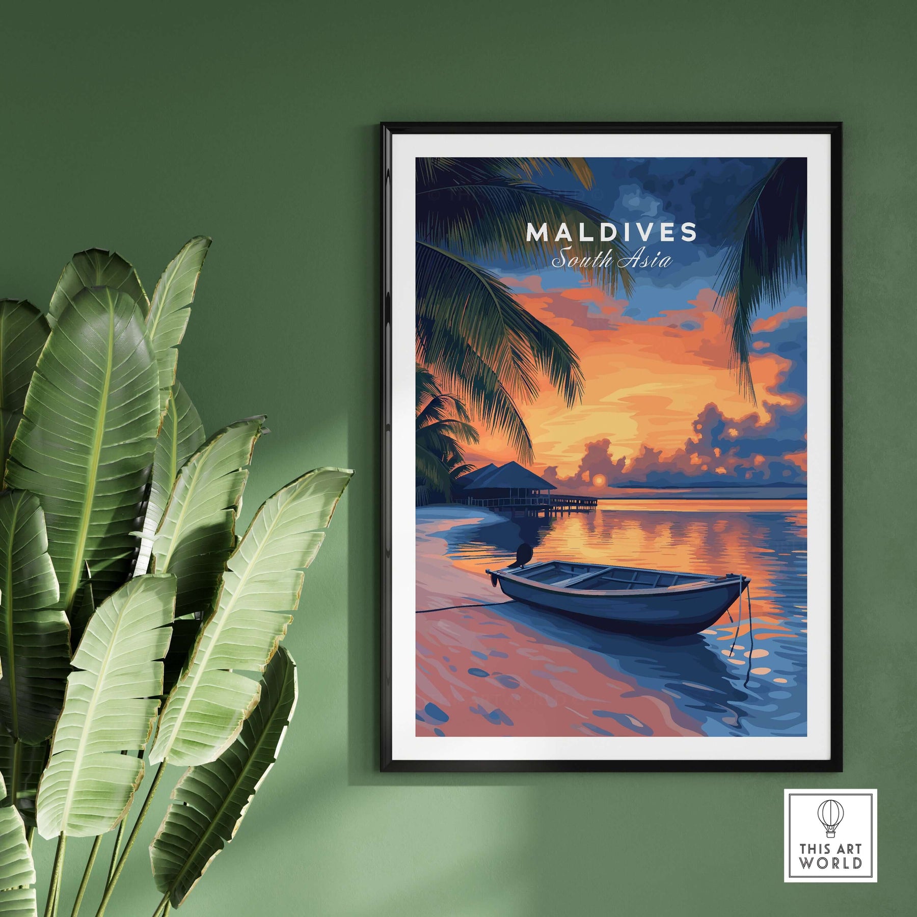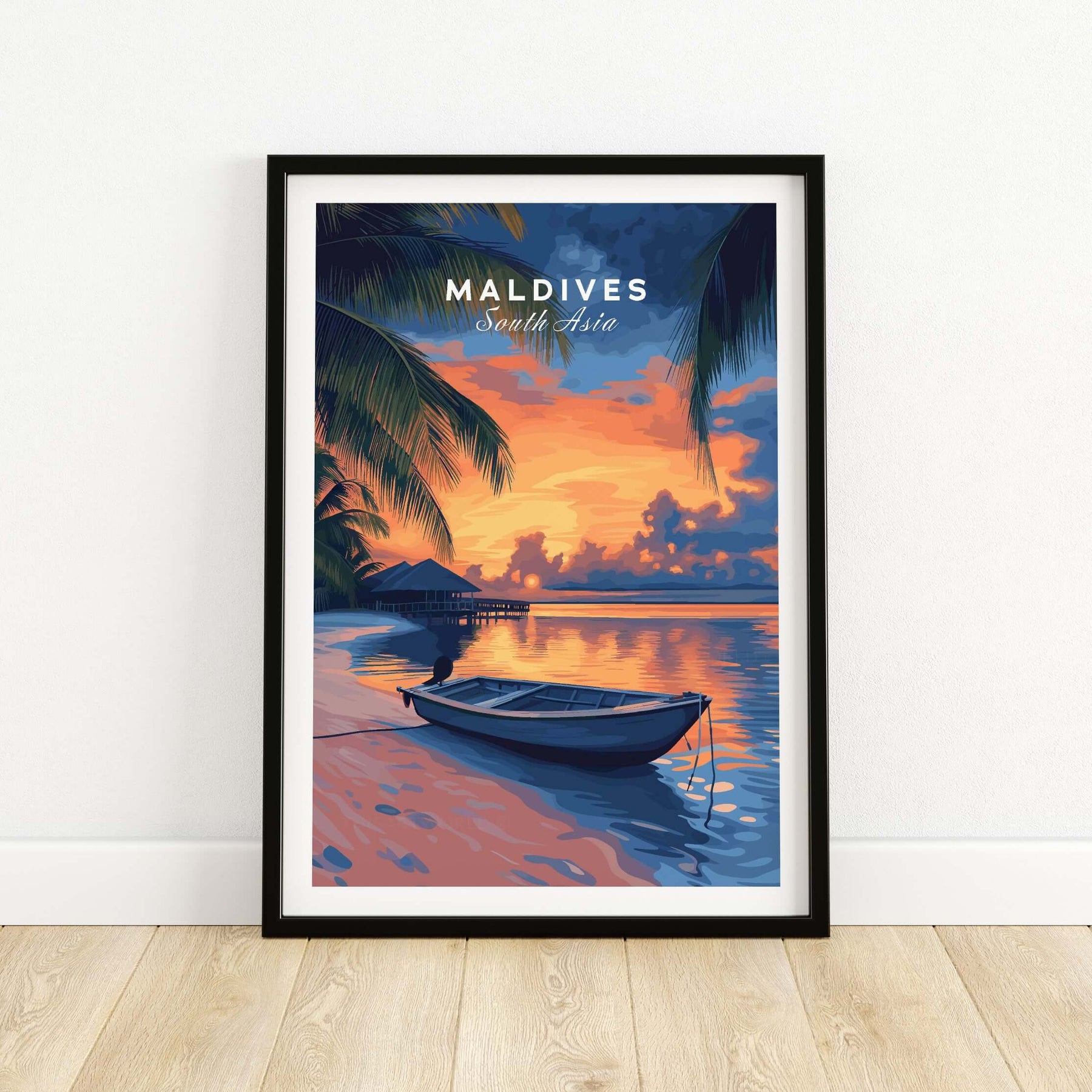 Maldives Travel Print - Sunset showcasing tropical colors and a serene boat scene, perfect for wanderlust decor.