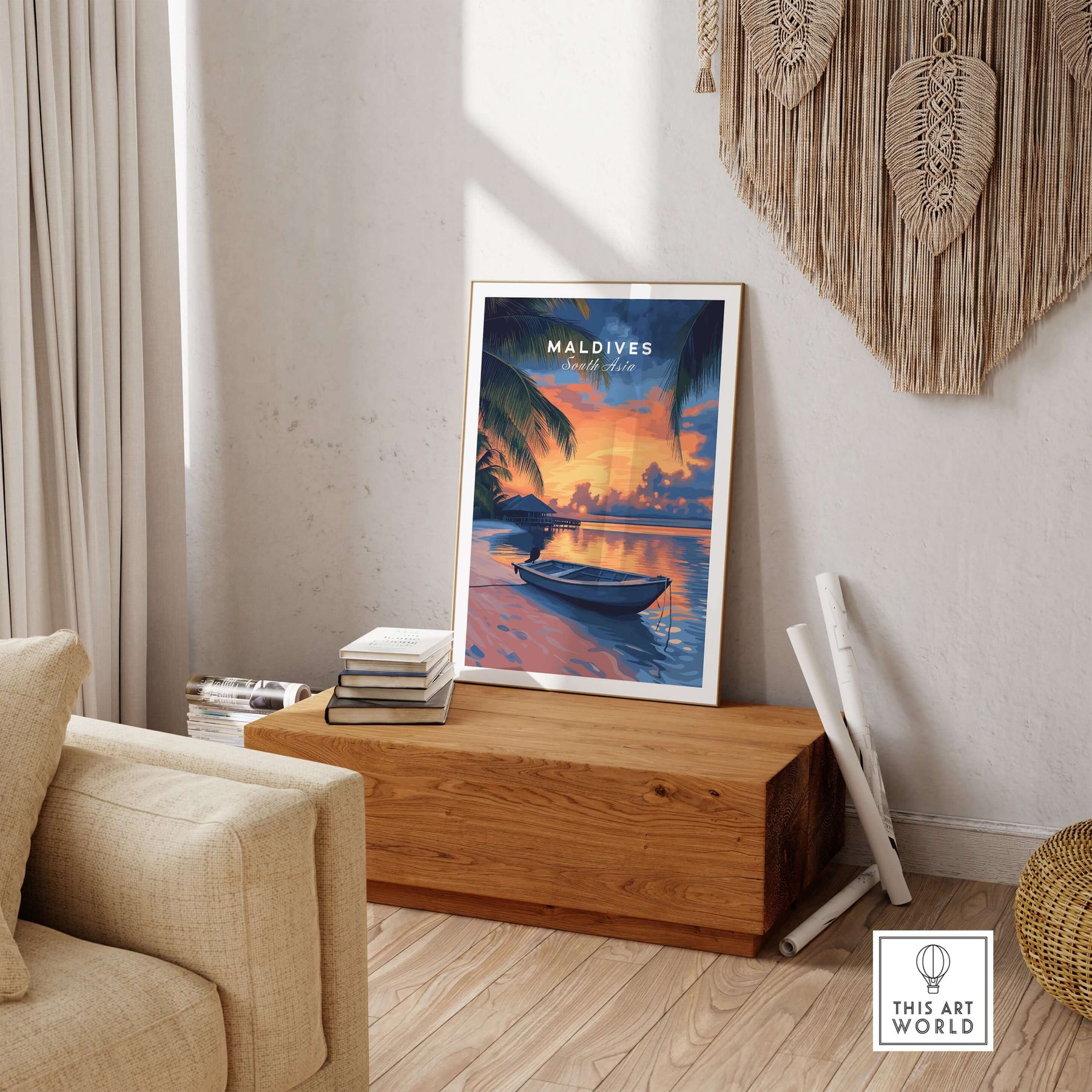 Maldives Travel Print - Sunset displayed on a stylish home interior with other travel prints.
