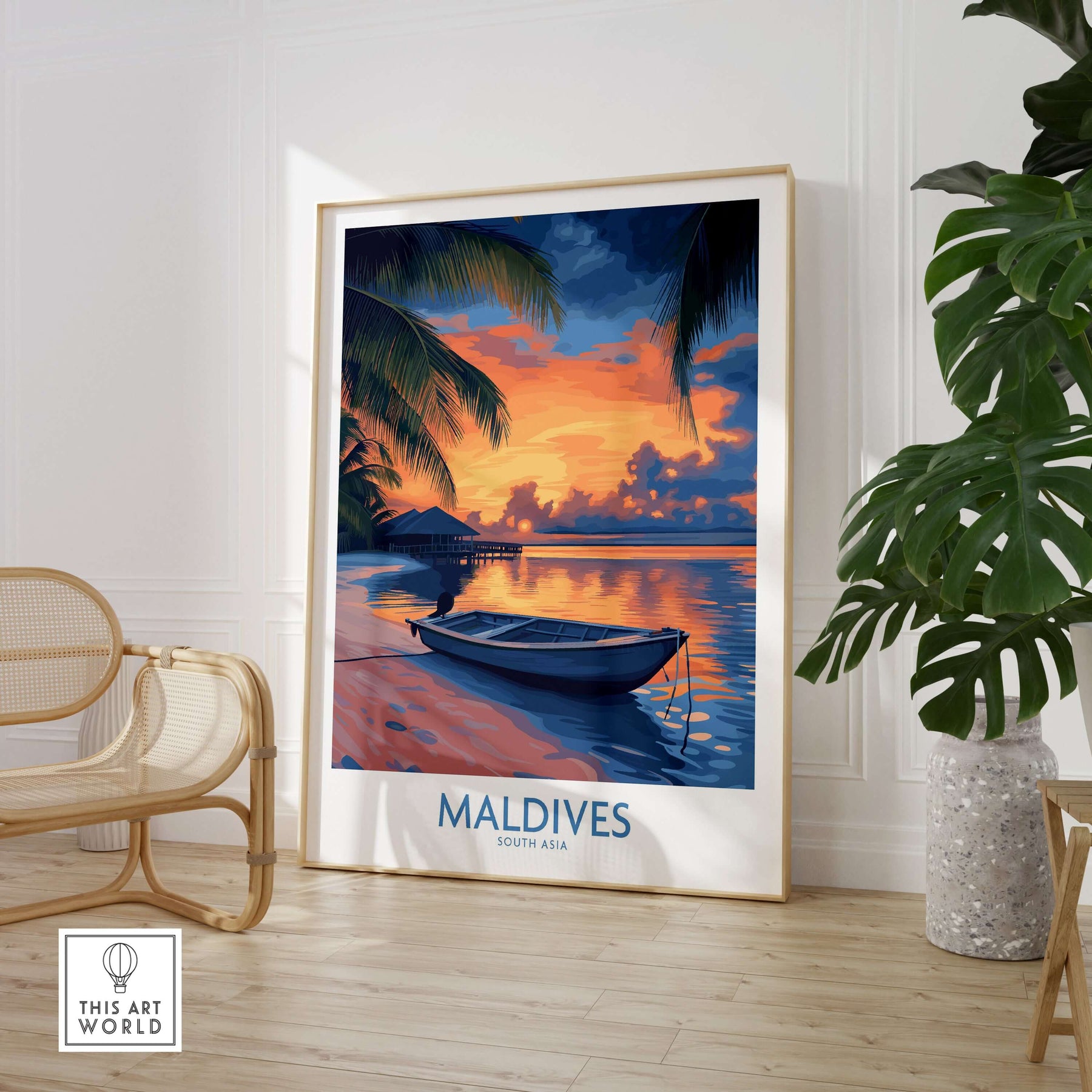 Maldives Wall Art Print - Sunset showcasing a vibrant tropical sunset in a stylish room setting.