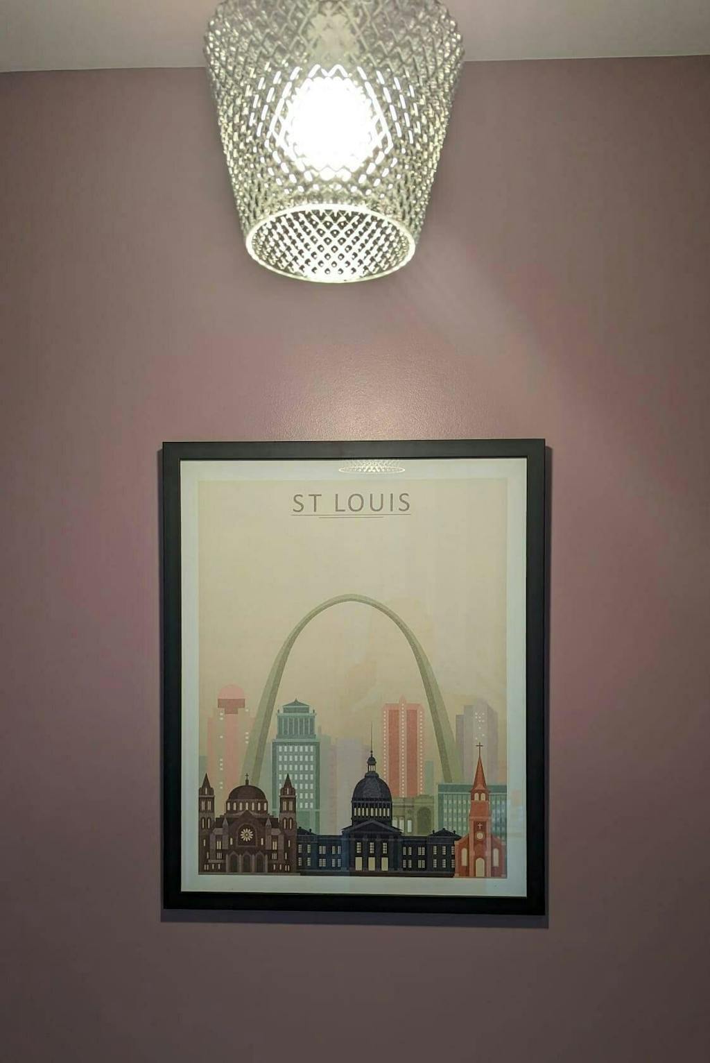St Louis City Skyline Wall Art Print featuring iconic buildings in pastel colors, framed against a green wall.
