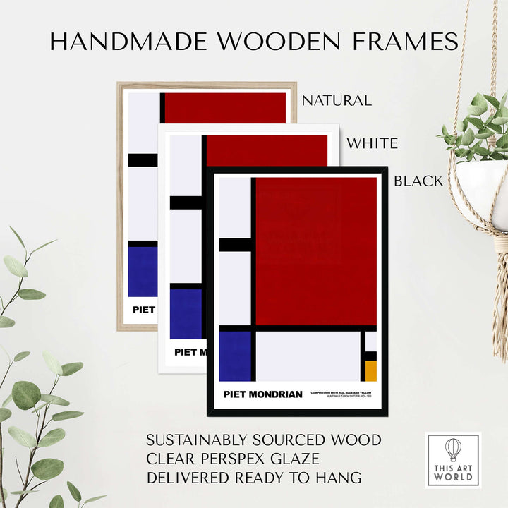 Handmade wooden frames in natural, white, and black for Piet Mondrian art prints, featuring sustainable materials.
