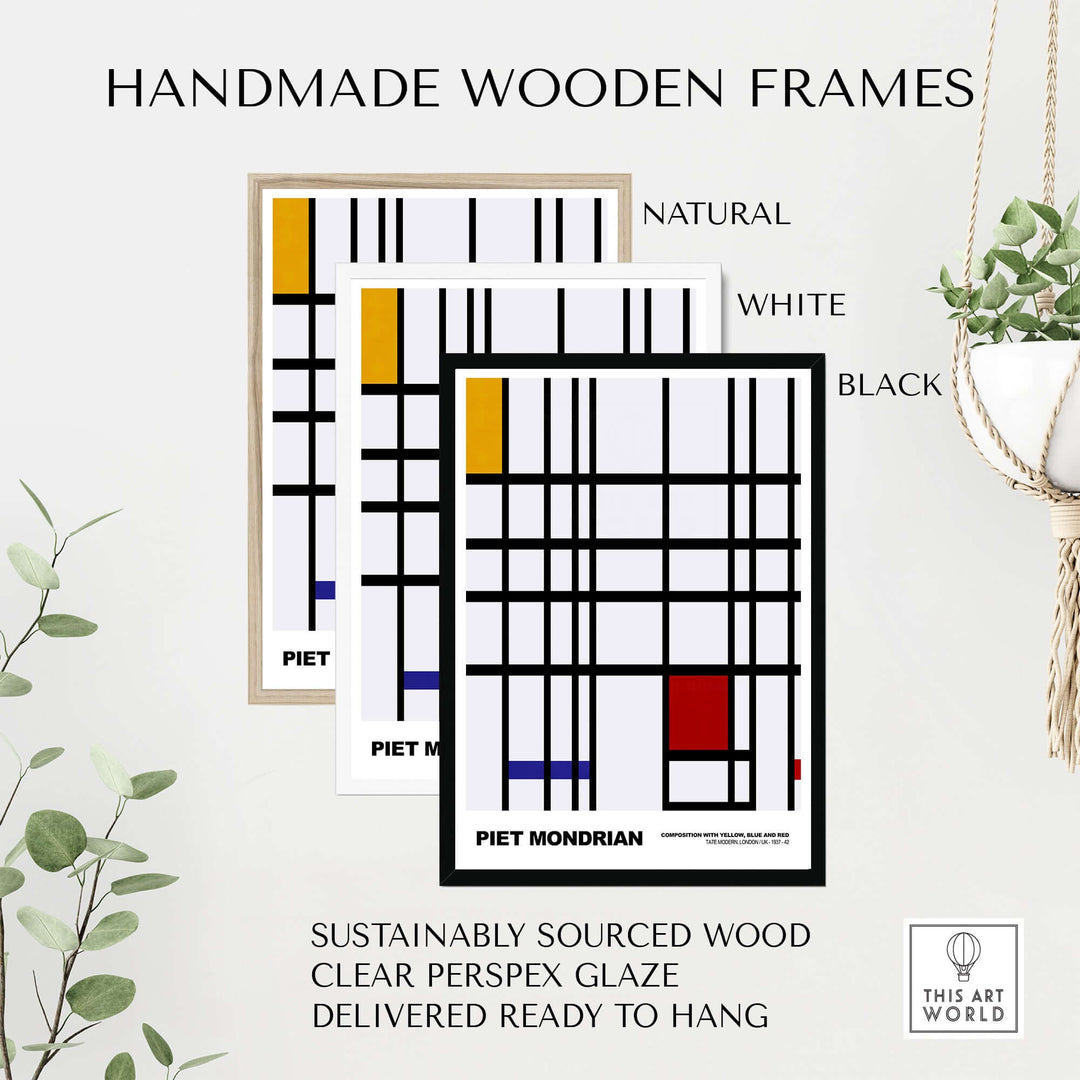 Handmade wooden frames for Piet Mondrian art prints in natural, white, and black colors, sustainably sourced and ready to hang.