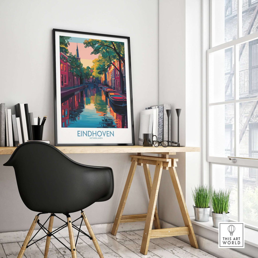 Eindhoven Art Print | Urban Sunset Reflections Poster displayed among other travel art prints in a cozy setting.