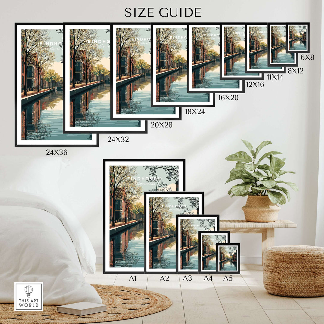 Eindhoven Print | Dutch City Wall Decor size guide showcasing framing options for urban art.
