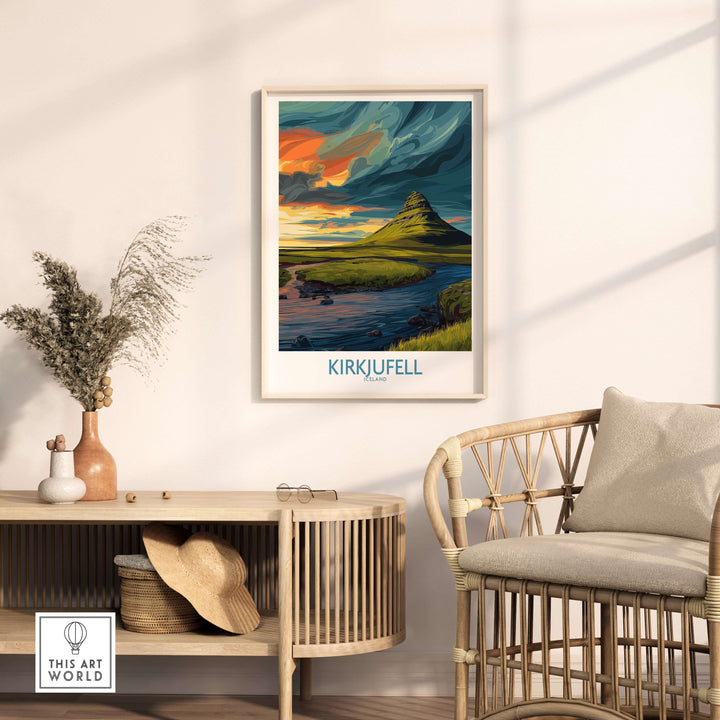 Kirkjufell Iceland Print | Dramatic Sunset River Poster displayed in a cozy room with a beautiful landscape.