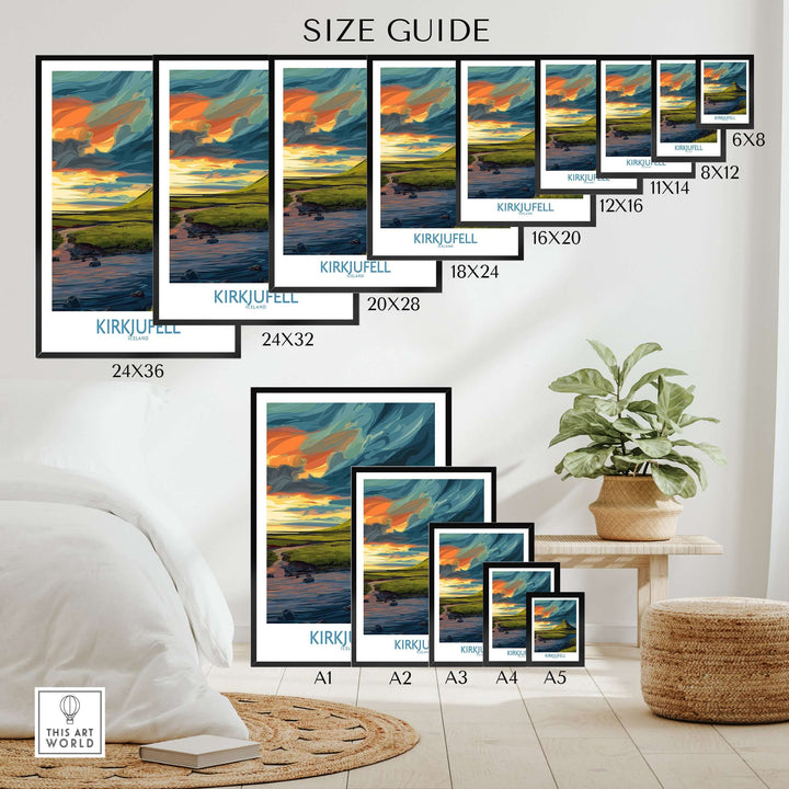 Kirkjufell Iceland Print | Dramatic Sunset River Poster size guide with various frame dimensions.