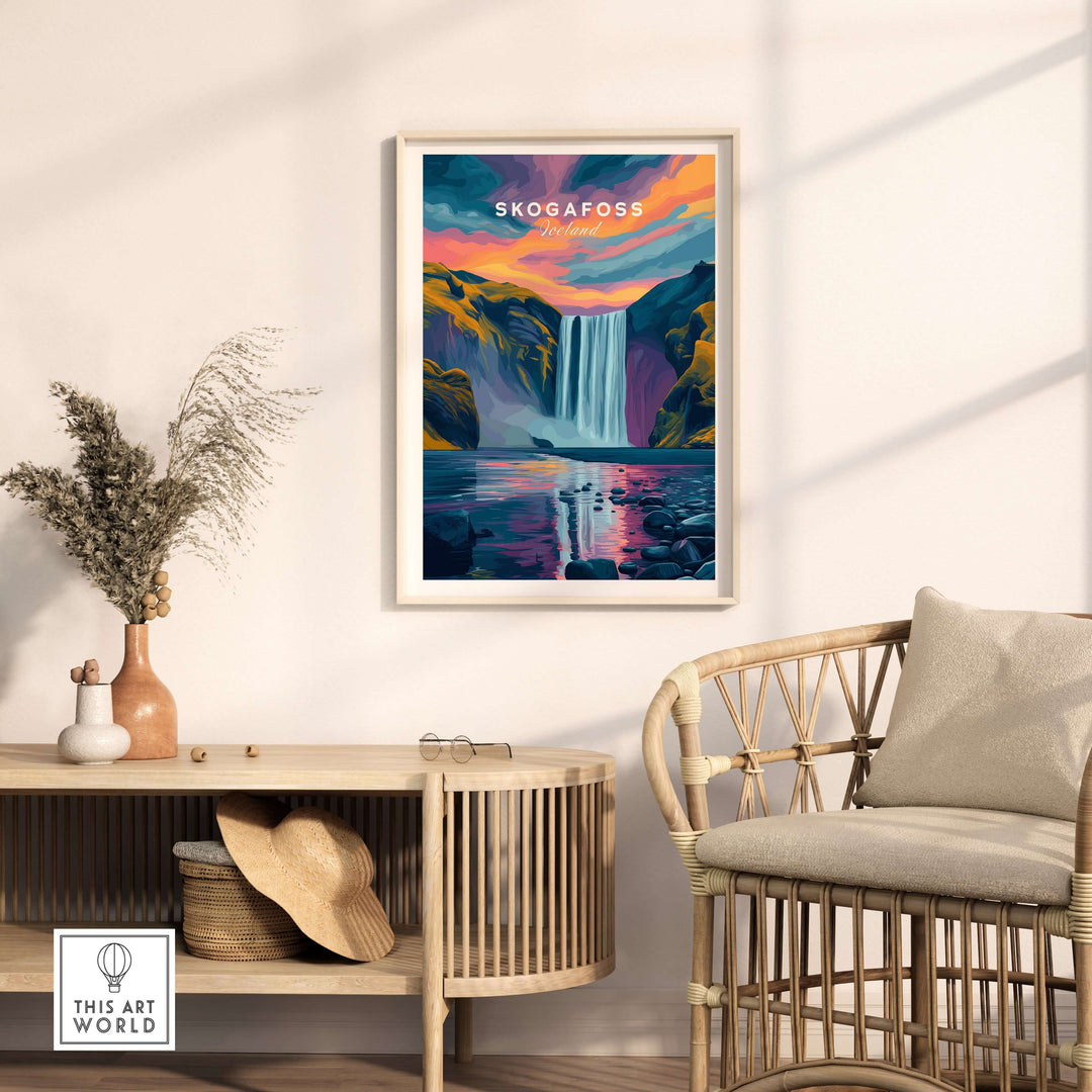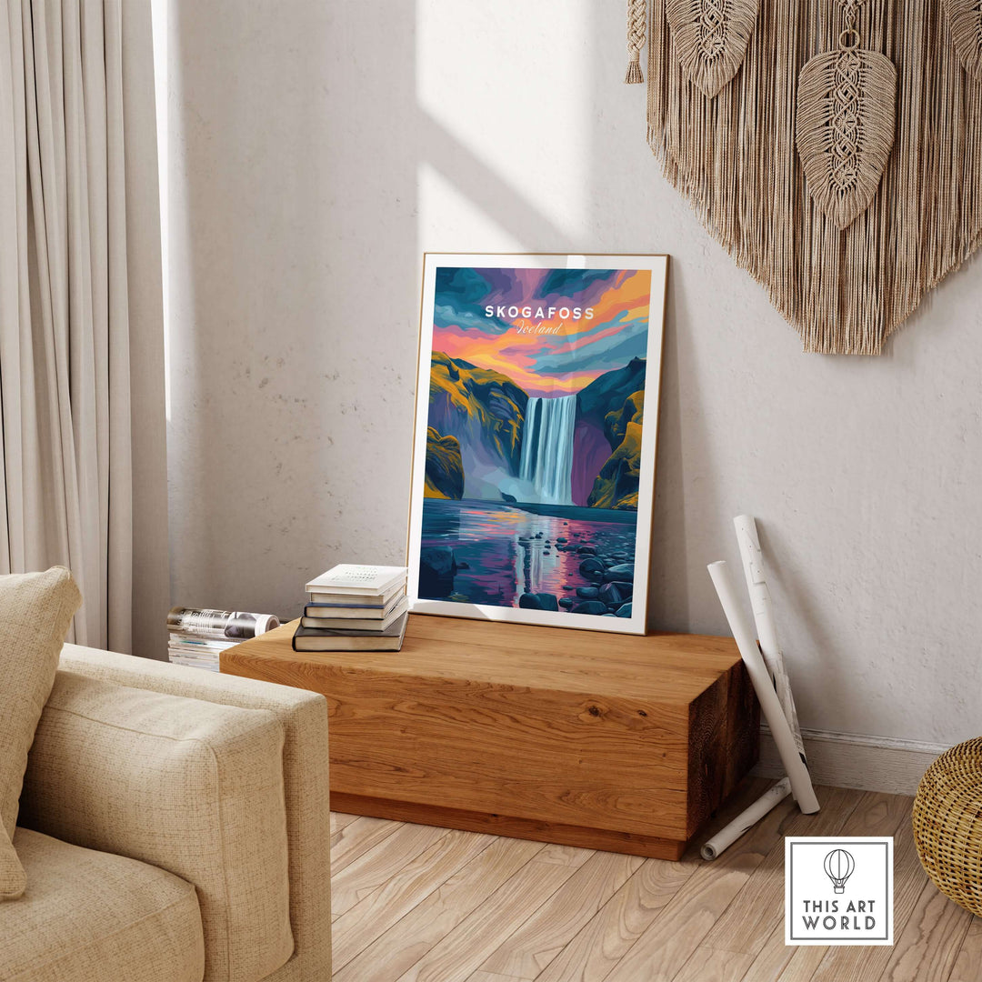 Skógafoss Wall Art Icland Poster displayed in a sunny room with modern decor, capturing Iceland's natural beauty.
