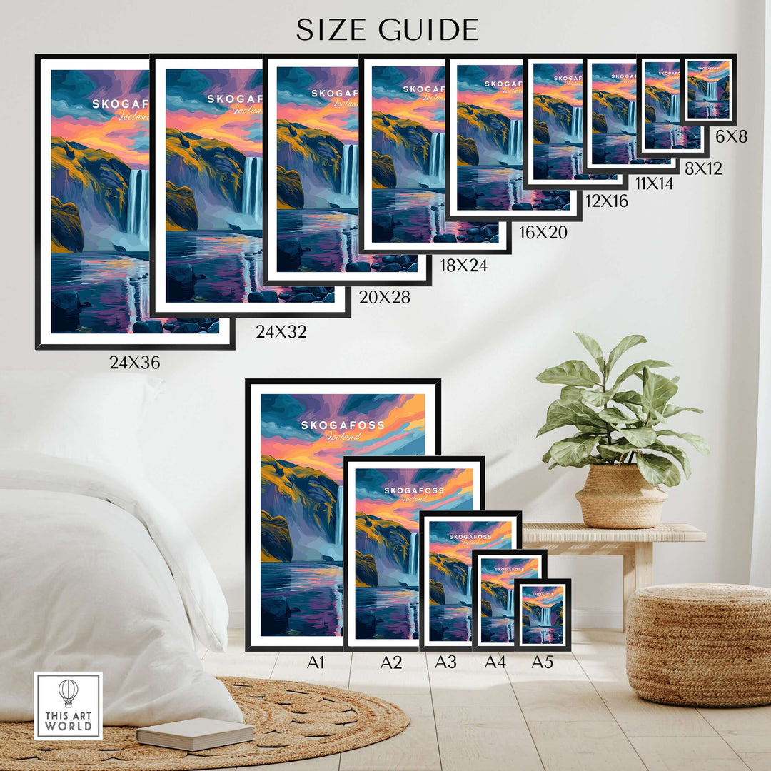 Skógafoss Wall Art Icland Poster size guide with different print dimensions displayed