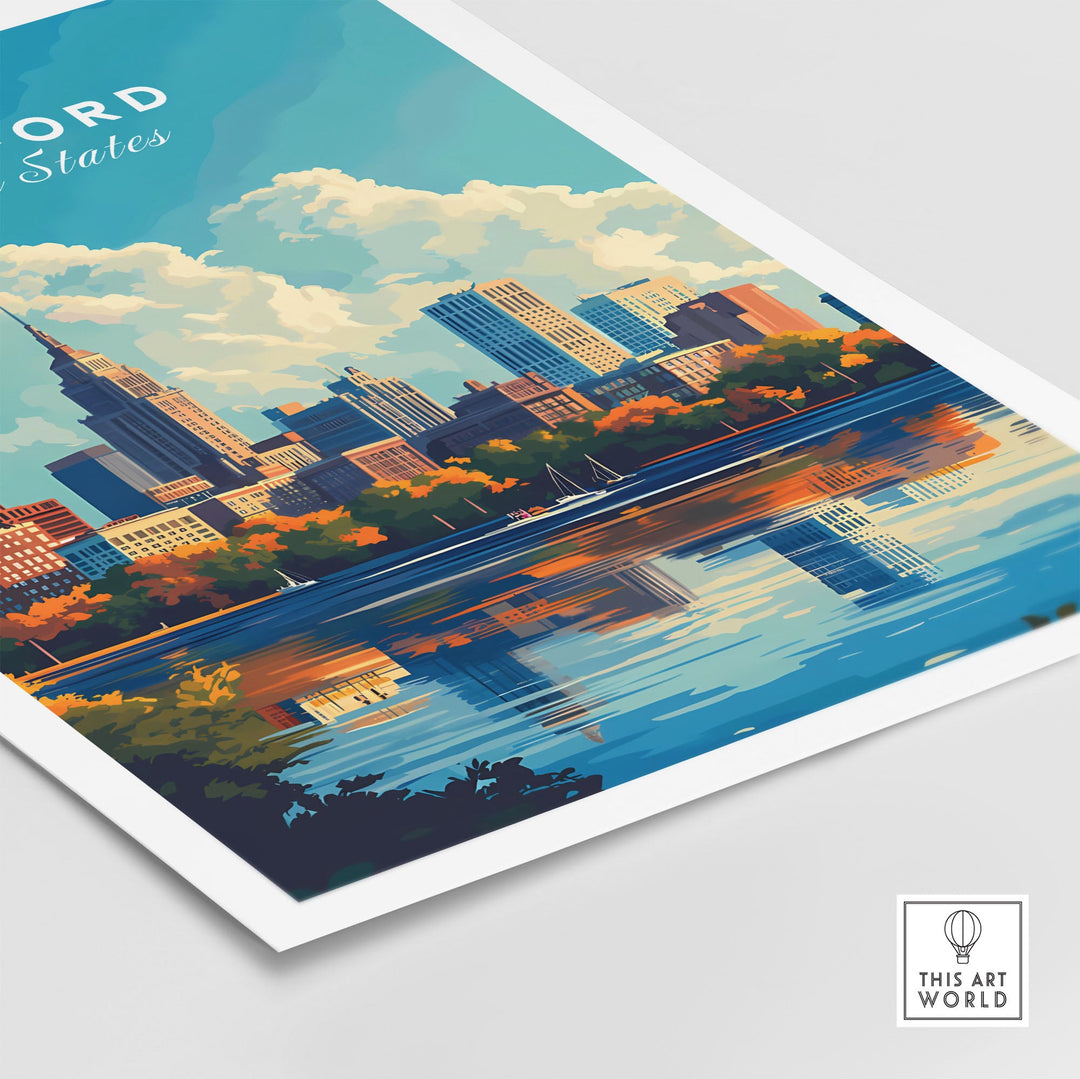 Hartford skyline poster featuring vibrant cityscape and reflections, perfect for home or office decor.