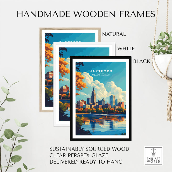 Hartford skyline poster in handmade wooden frames, available in natural, white, and black. Perfect for home or office decor.