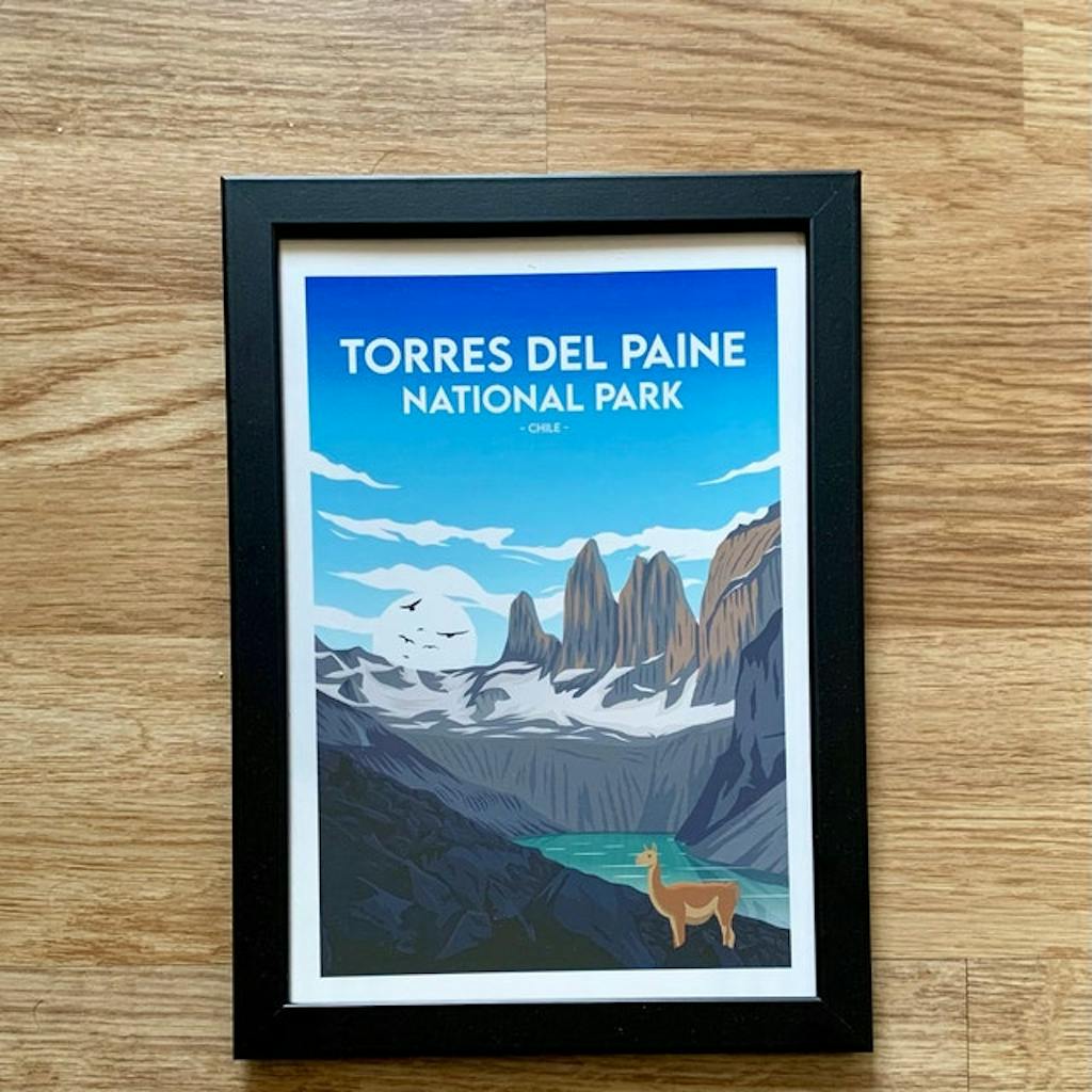 Framed Torres del Paine National Park print showcasing vintage travel art and mountain landscapes.