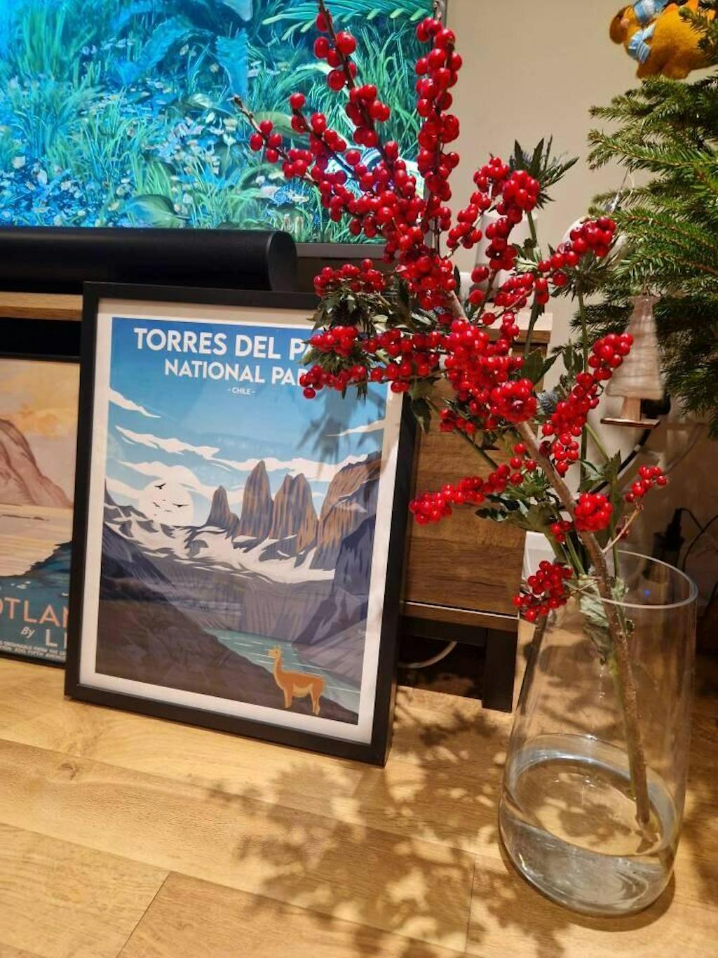 Torres del Paine National Park print showcased in a stylish home setting, celebrating travel and art.