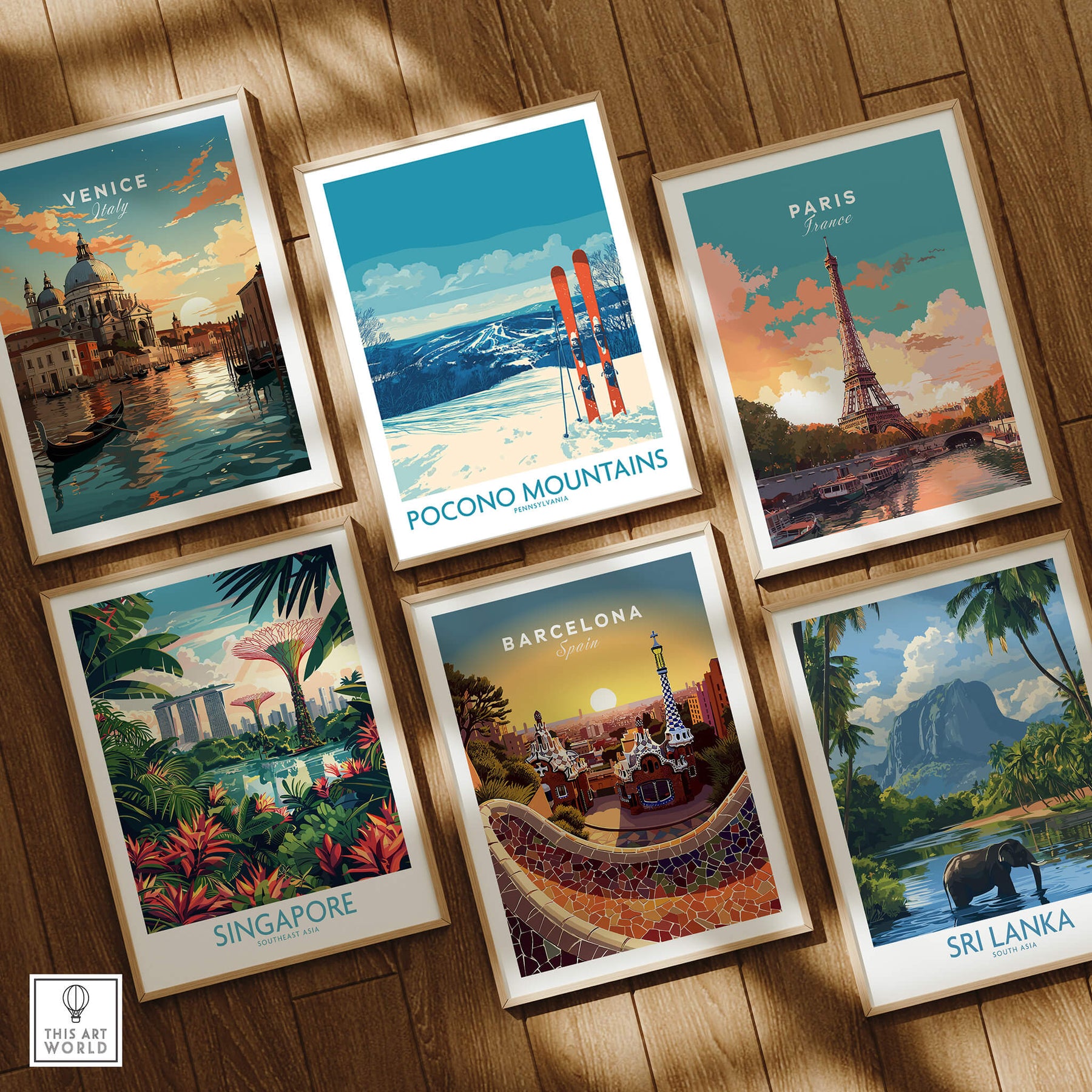 Pocono Mountains Ski Retreat Wall Art - Pennsylvania Mountain Decor displayed among travel-themed art prints.