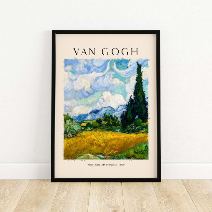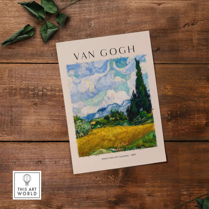 Vincent van Gogh Wheat Field with Cypresses art print on wooden surface, showcasing vibrant colors and swirling clouds.