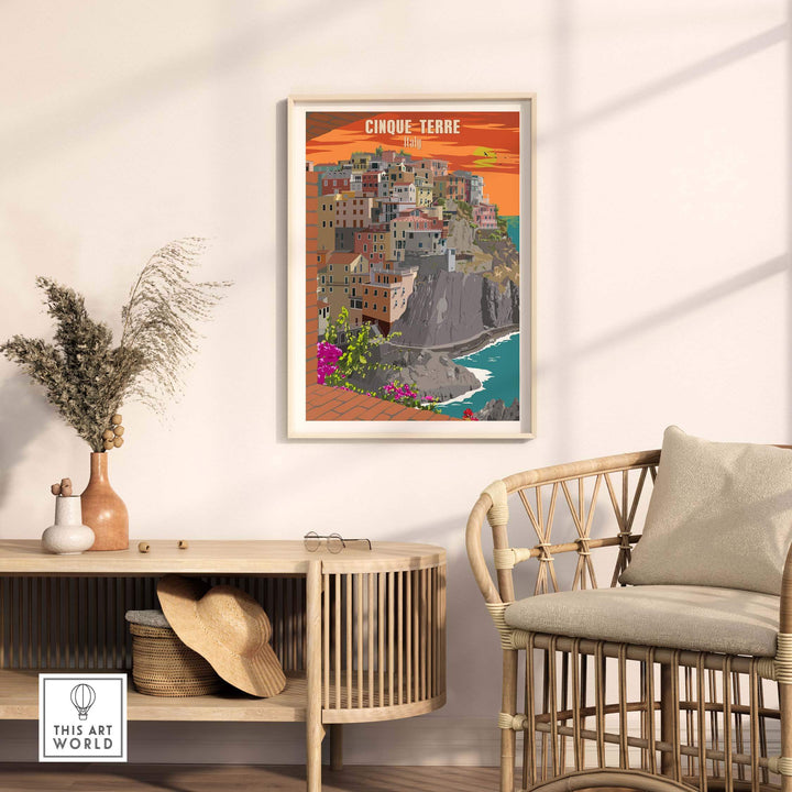 Cinque Terre Italy poster print wall art in a stylish living room setting, showcasing vintage travel aesthetics.