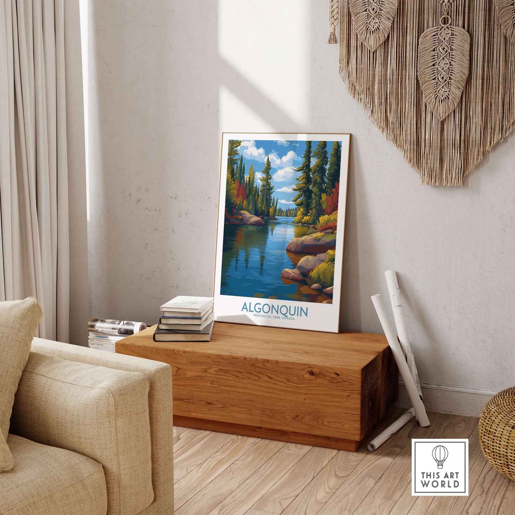 Algonquin Autumn Forest Art Print | Canada Fall Wilderness Poster displayed in a cozy room with serene decor.