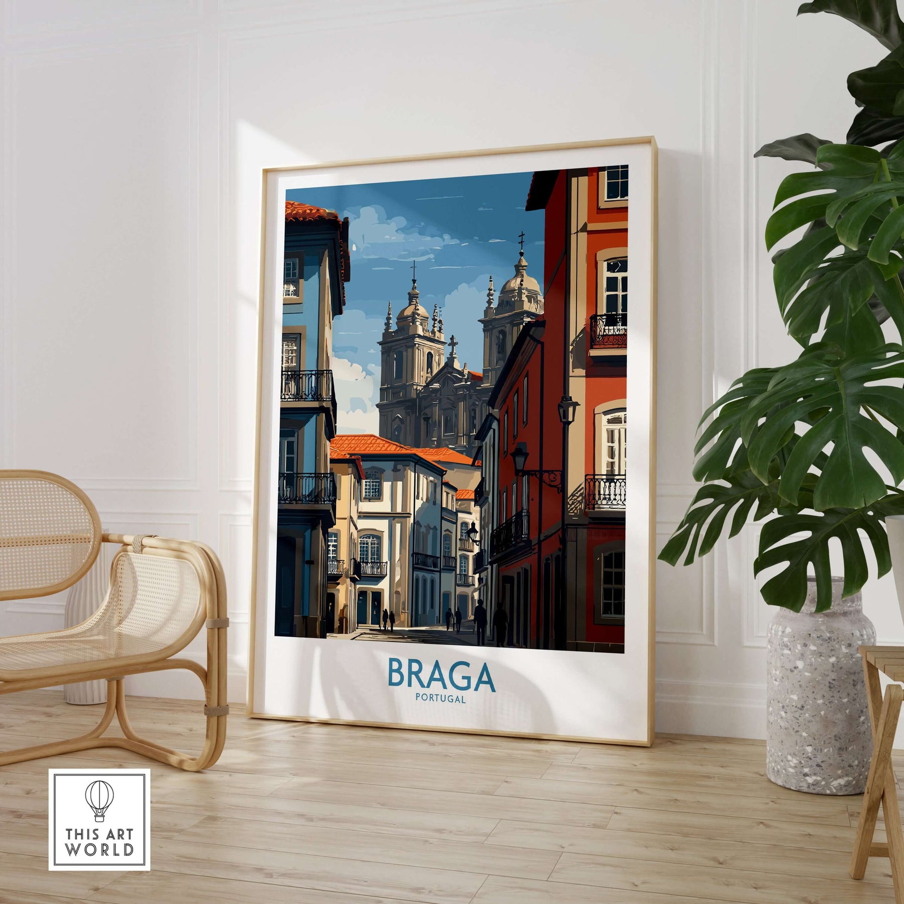 Braga Portugal Cathedral Street View Art Print | Colourful City Poster showcased in a stylish interior setting.