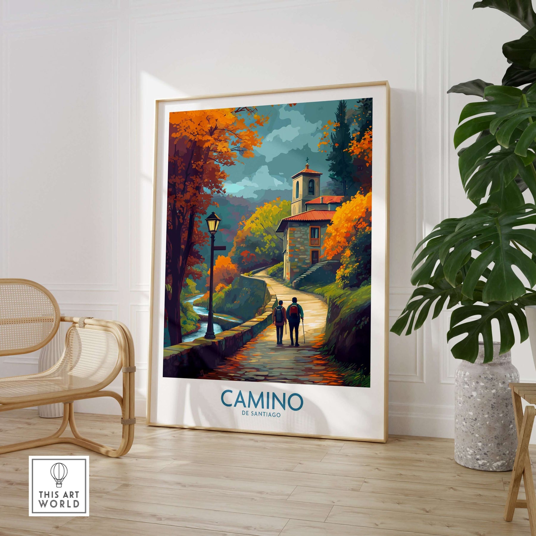 Camino de Santiago Autumn Path Art Print | Pilgrim Trail Travel Poster displayed in a modern home setting with autumn scenery.