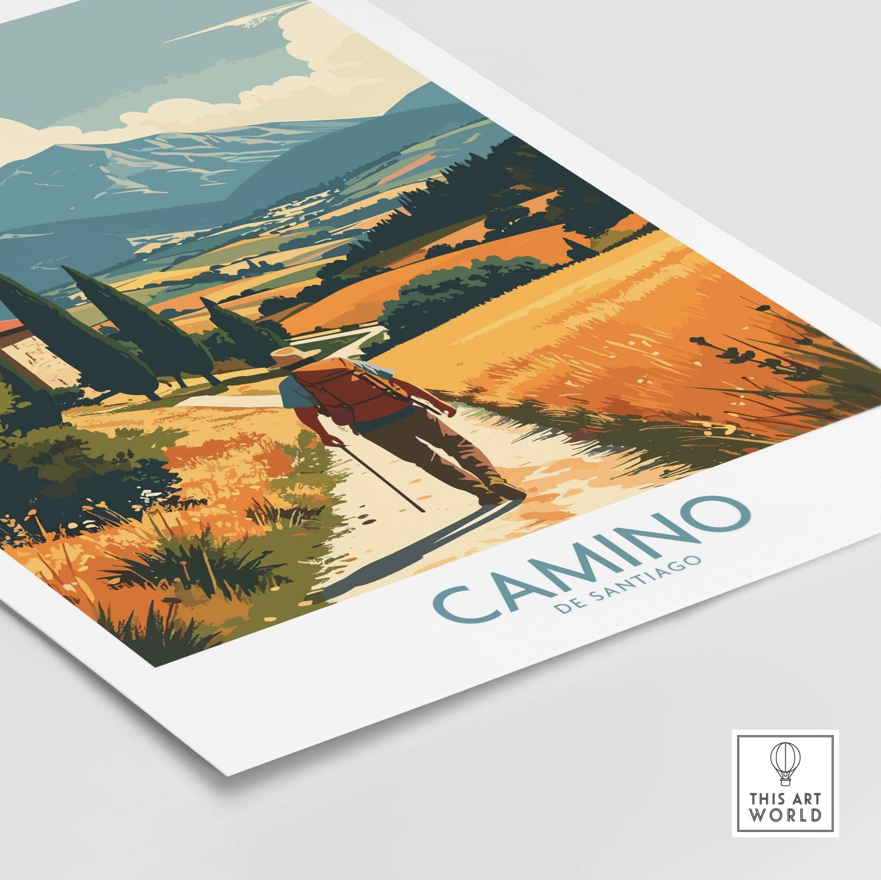 Camino de Santiago Golden Fields Art Print | Spanish Pilgrimage Poster featuring vibrant landscapes and pilgrims.