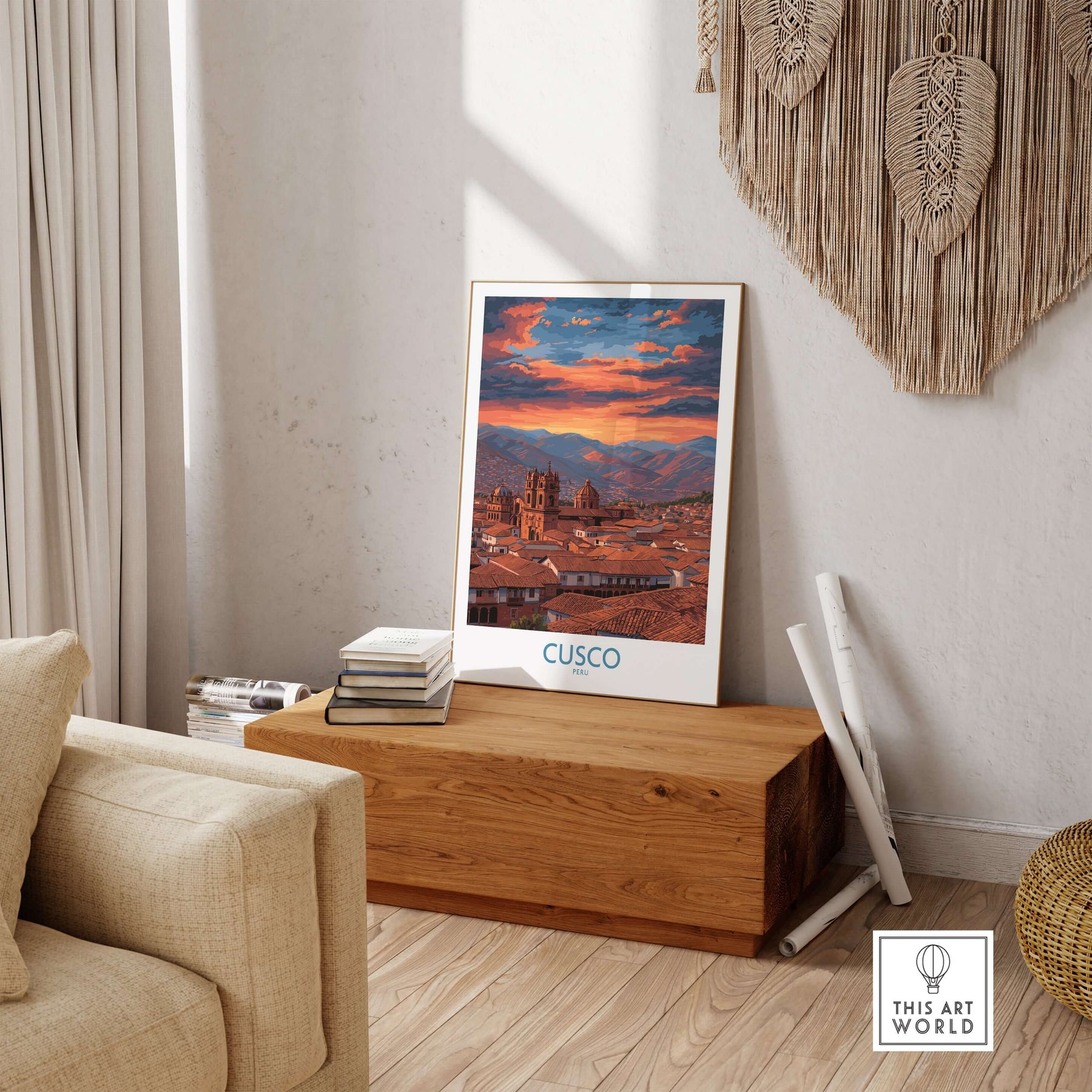 Cusco Peru Orange Sunset Art Print | Mountain City Skyline Poster displayed in a cozy living room setting.