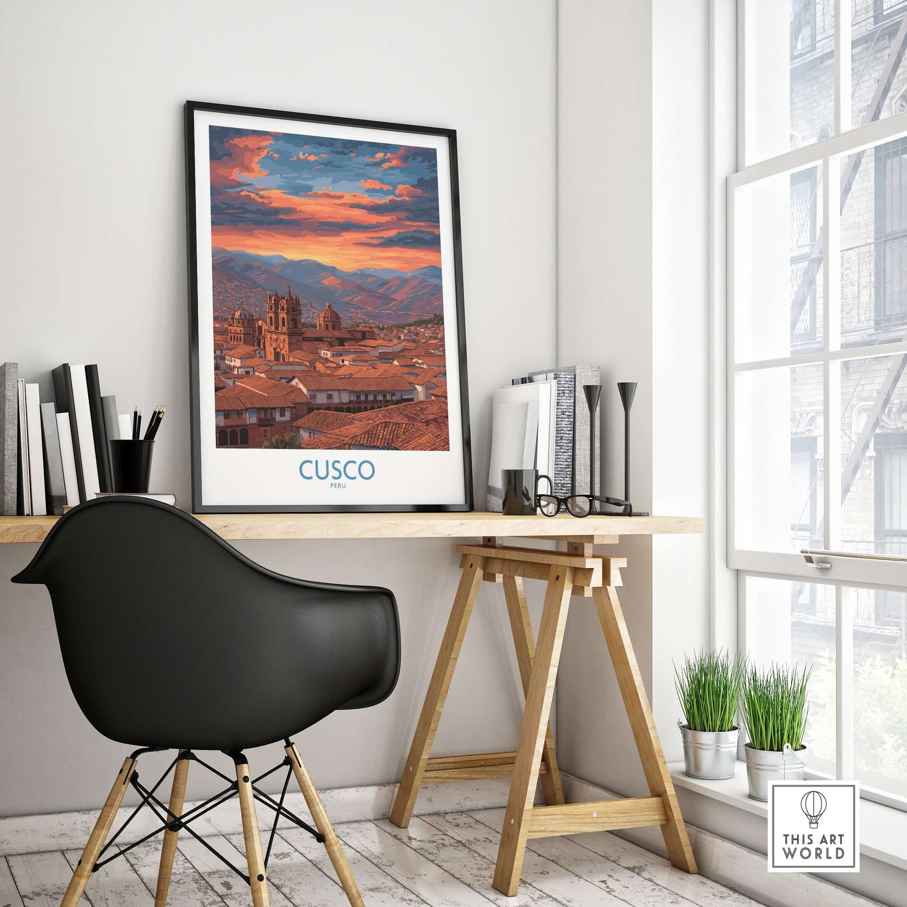 Cusco Peru Orange Sunset Art Print | Mountain City Skyline Poster displayed in a modern office setting.
