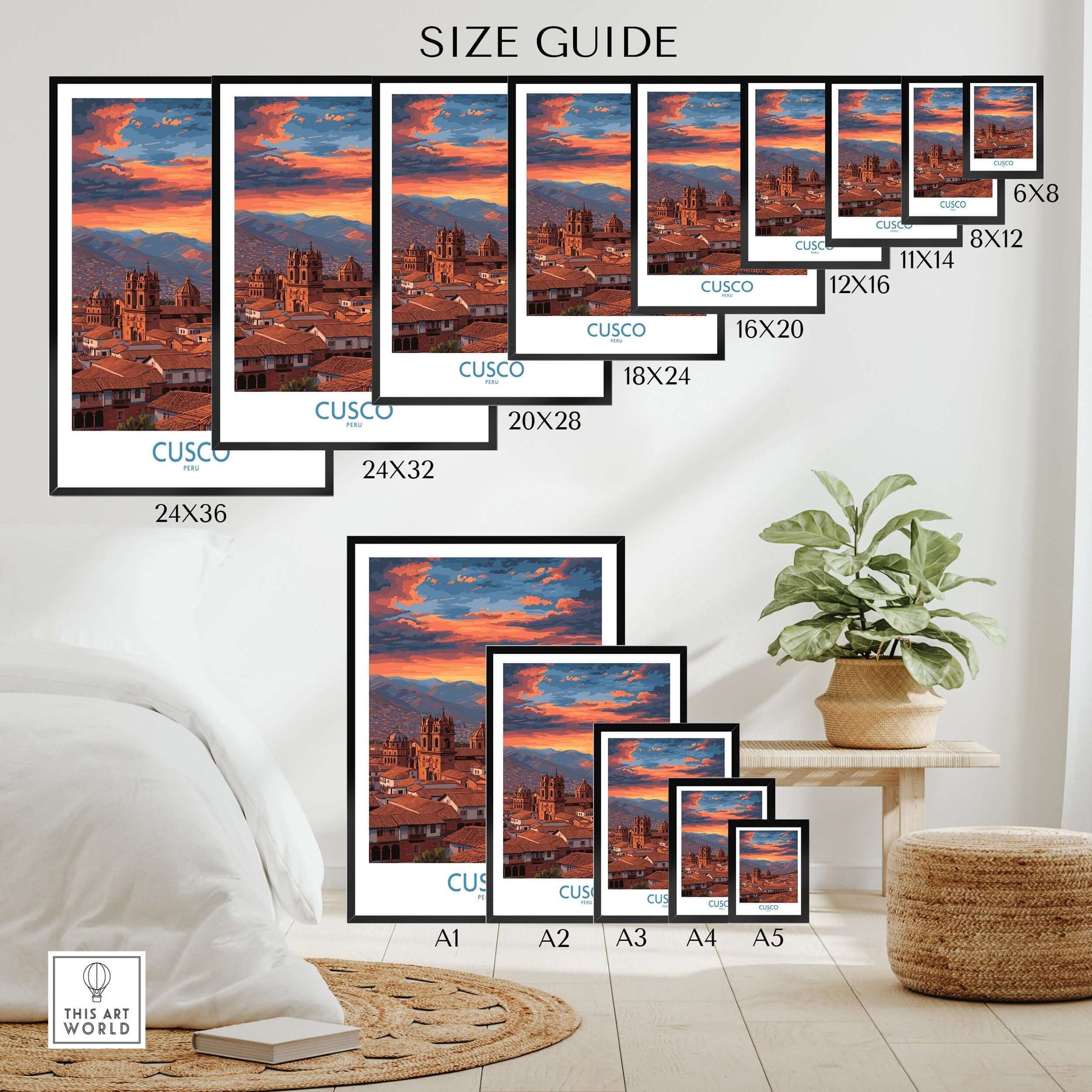 Cusco Peru Orange Sunset Art Print | Mountain City Skyline Poster size guide showing available dimensions.