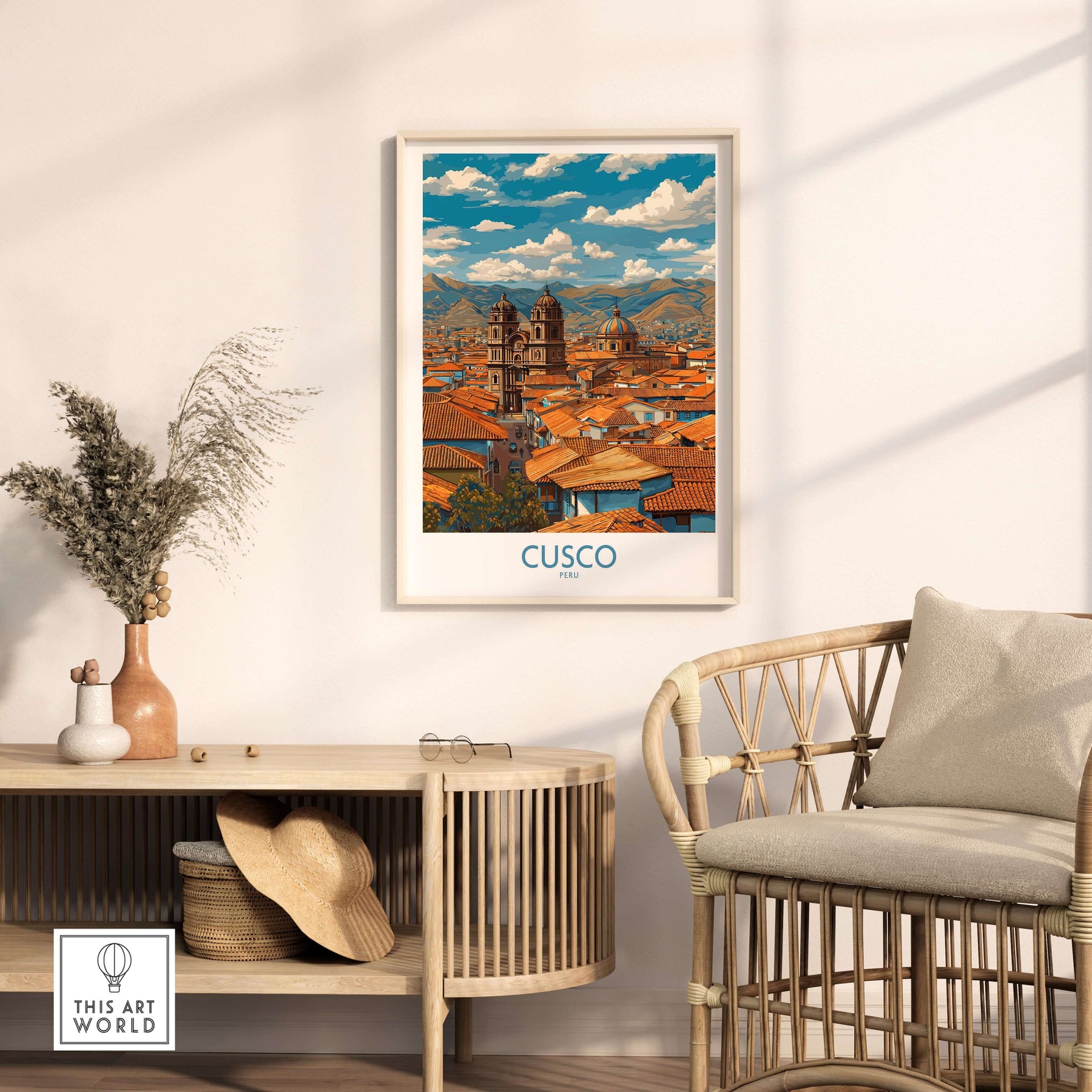 Cusco Peru Rooftops and Cathedral Art Print | Andes Cityscape Poster displayed in a stylish home setting.
