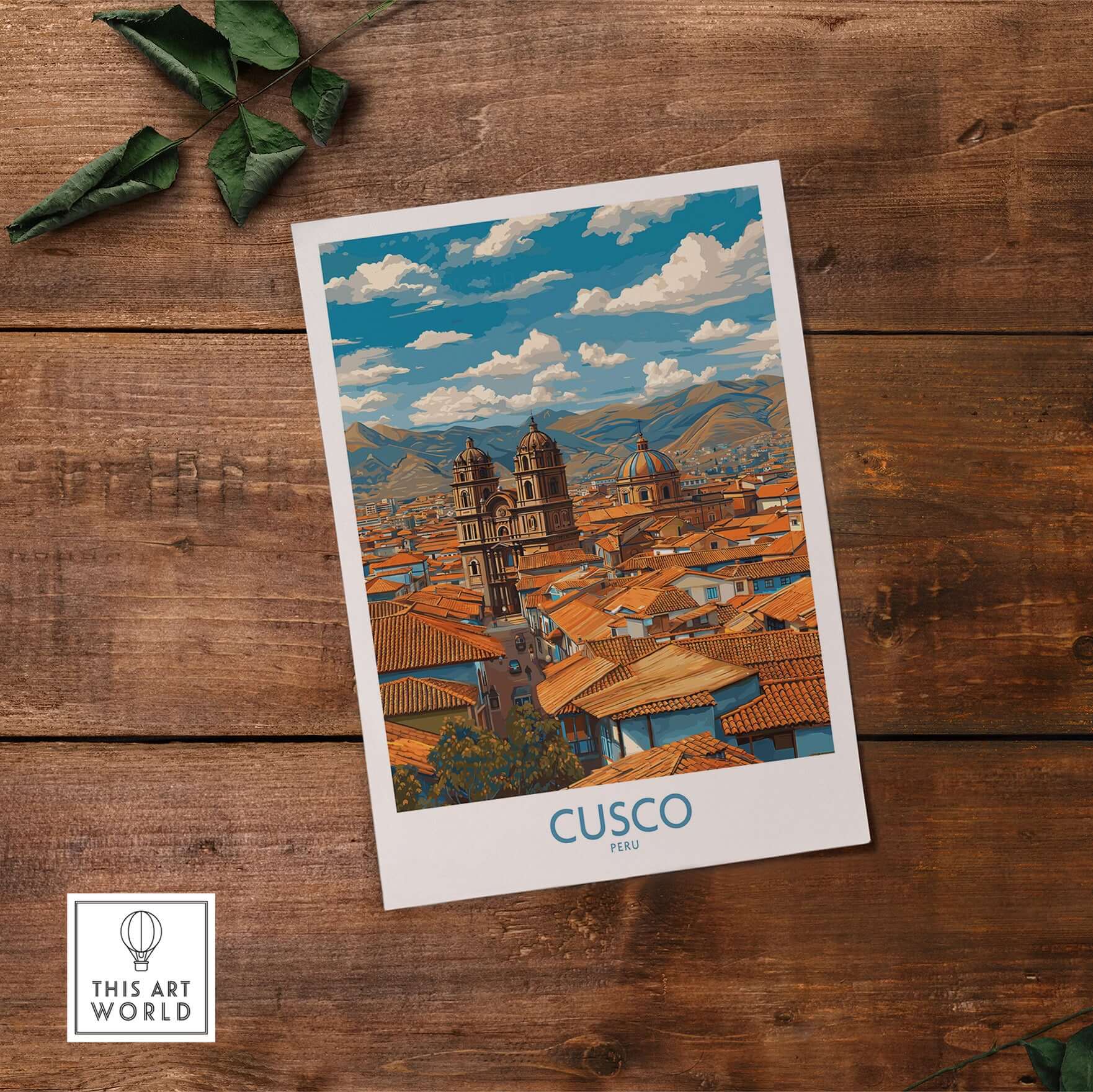 Cusco Peru Rooftops and Cathedral Art Print | Andes Cityscape Poster displayed in a modern workspace.
