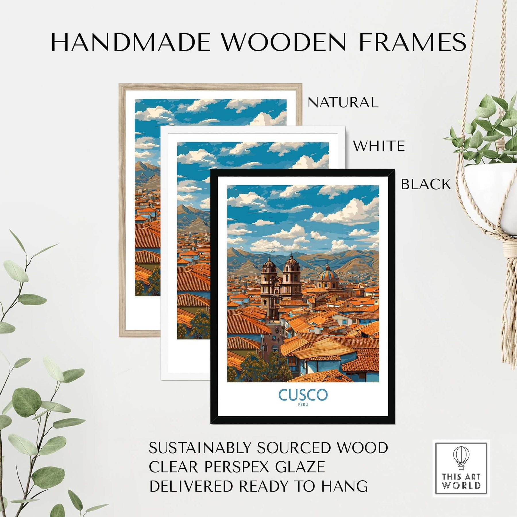 Cusco Peru Rooftops and Cathedral Art Print | Andes Cityscape Poster displayed in handmade wooden frames.