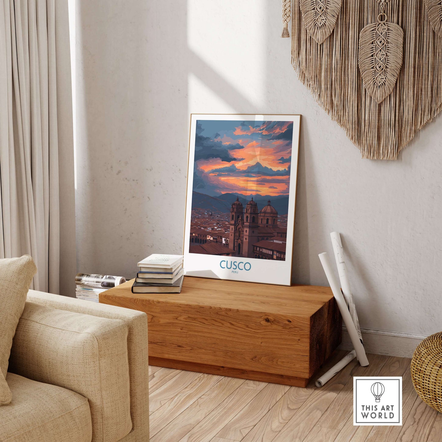 Cusco Peru Sunset Cathedral Art Print | Vibrant Andes City Poster displayed in a cozy living room setting.