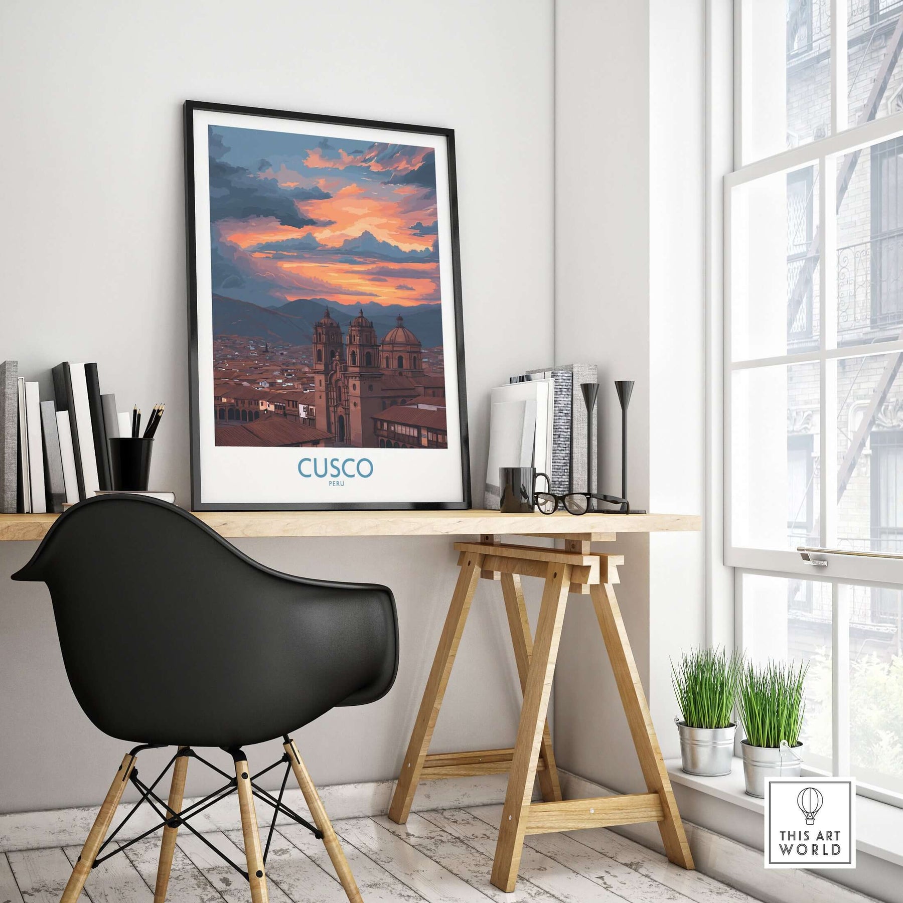 Cusco Peru Sunset Cathedral Art Print | Vibrant Andes City Poster framed in a modern workspace with desk and chair.