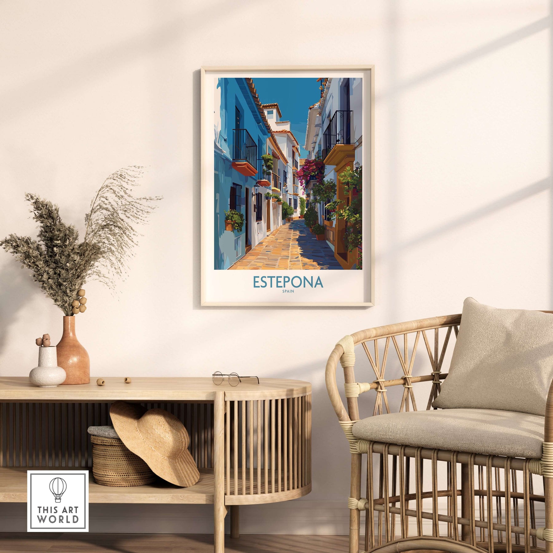 Estepona Spain Art Print | Spanish Architecture Poster displayed in a stylish living room setting.
