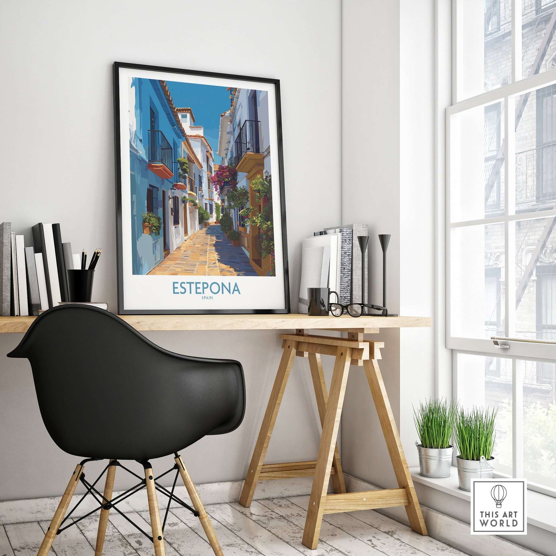Estepona Spain Art Print | Spanish Architecture Poster displayed in a stylish home office with modern decor.