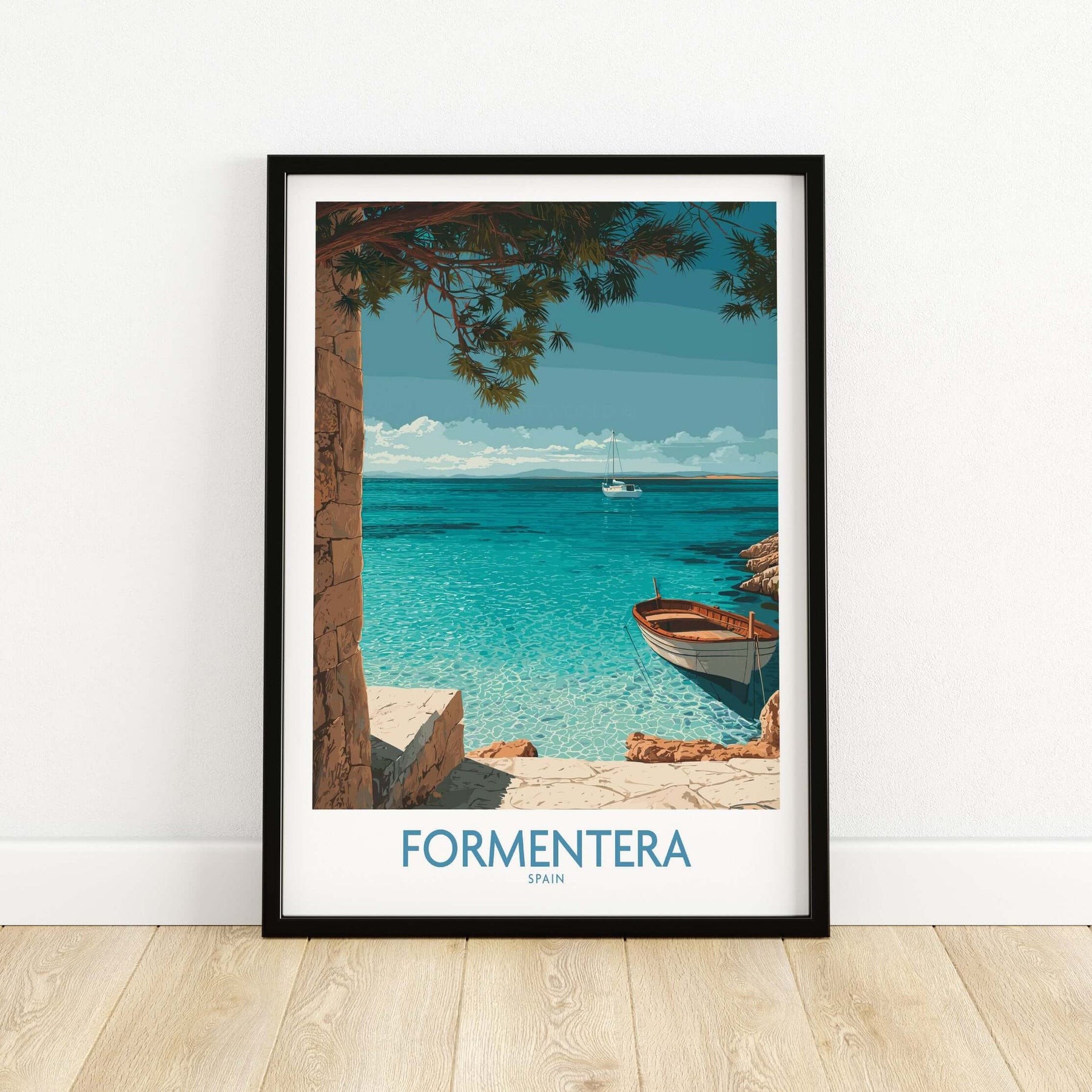 Formentera Spain Art Print | Beach Poster with turquoise waters and a boat, capturing the serene beauty of Formentera.