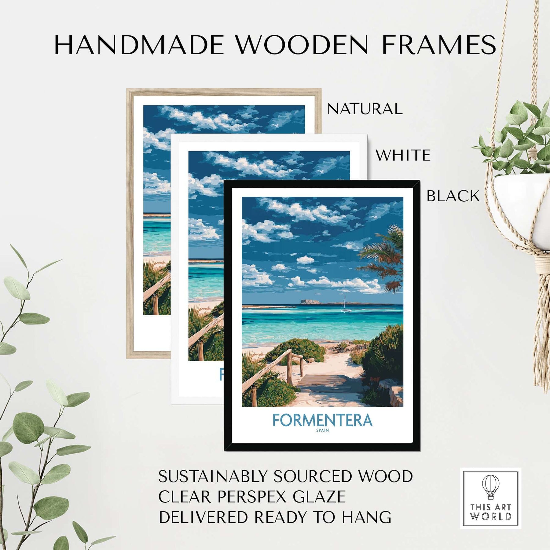 Formentera Spain Art Print | Tropical Beach Travel Poster in handmade wooden frames including natural, white, and black.