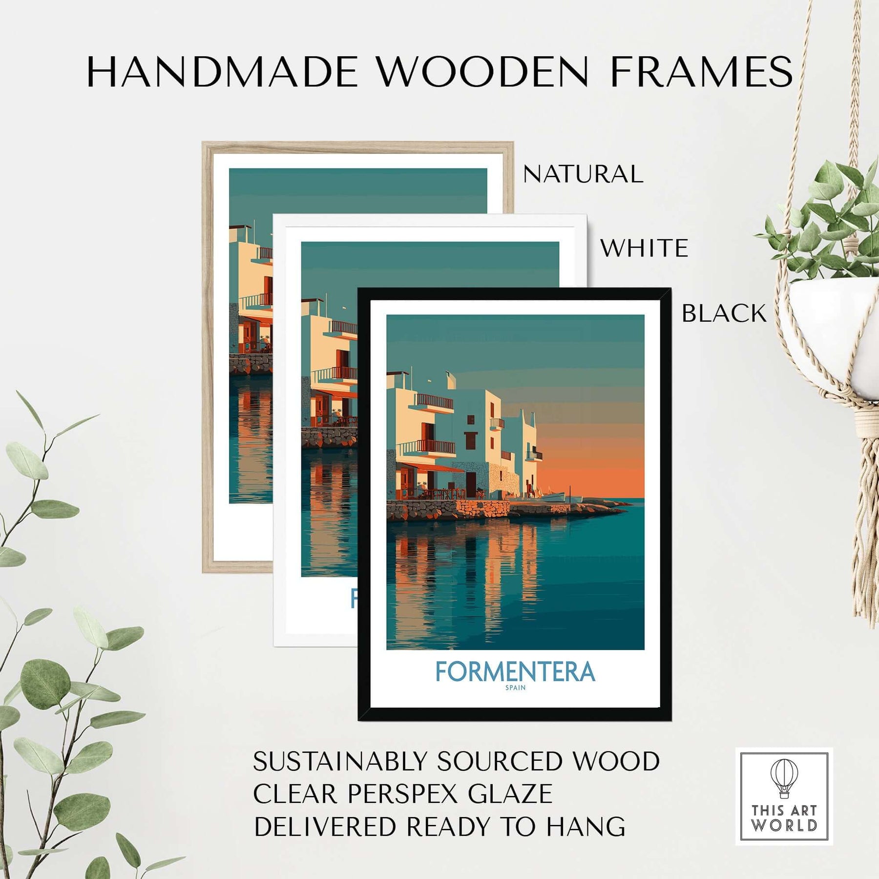 Formentera Spain Sunset White Houses Art Print | Balearic Island Poster with handmade wooden frames in natural, white, and black.