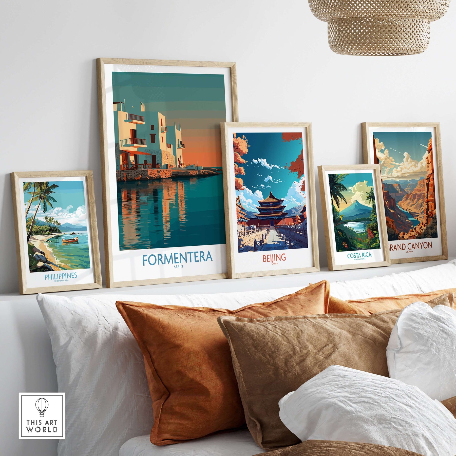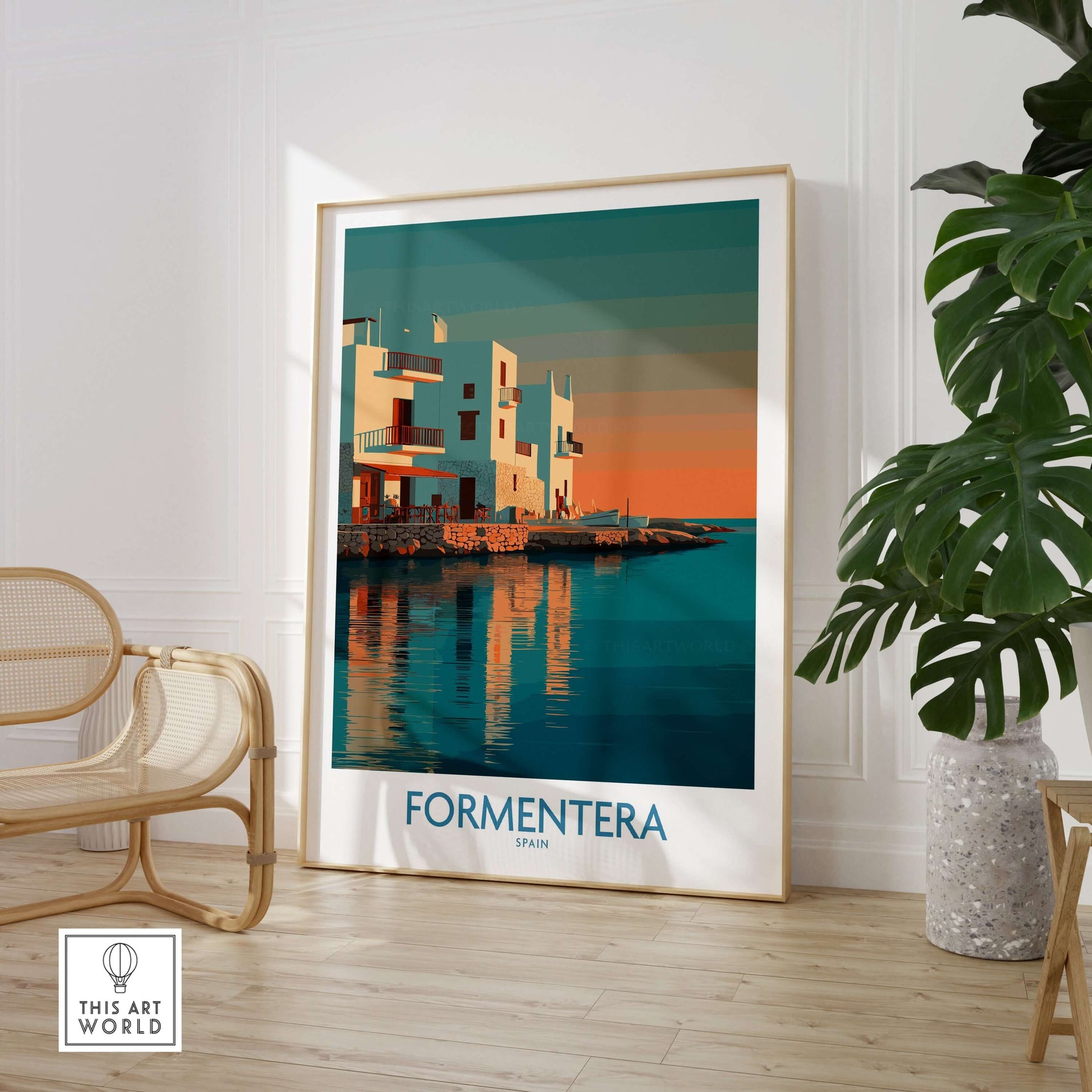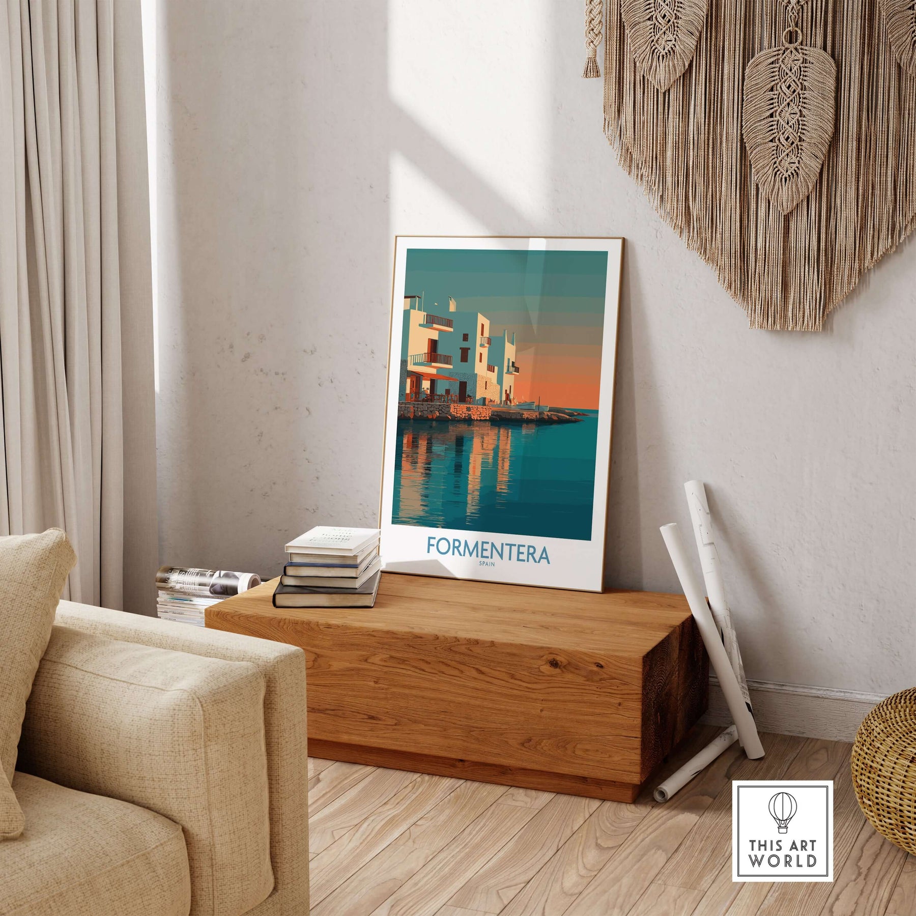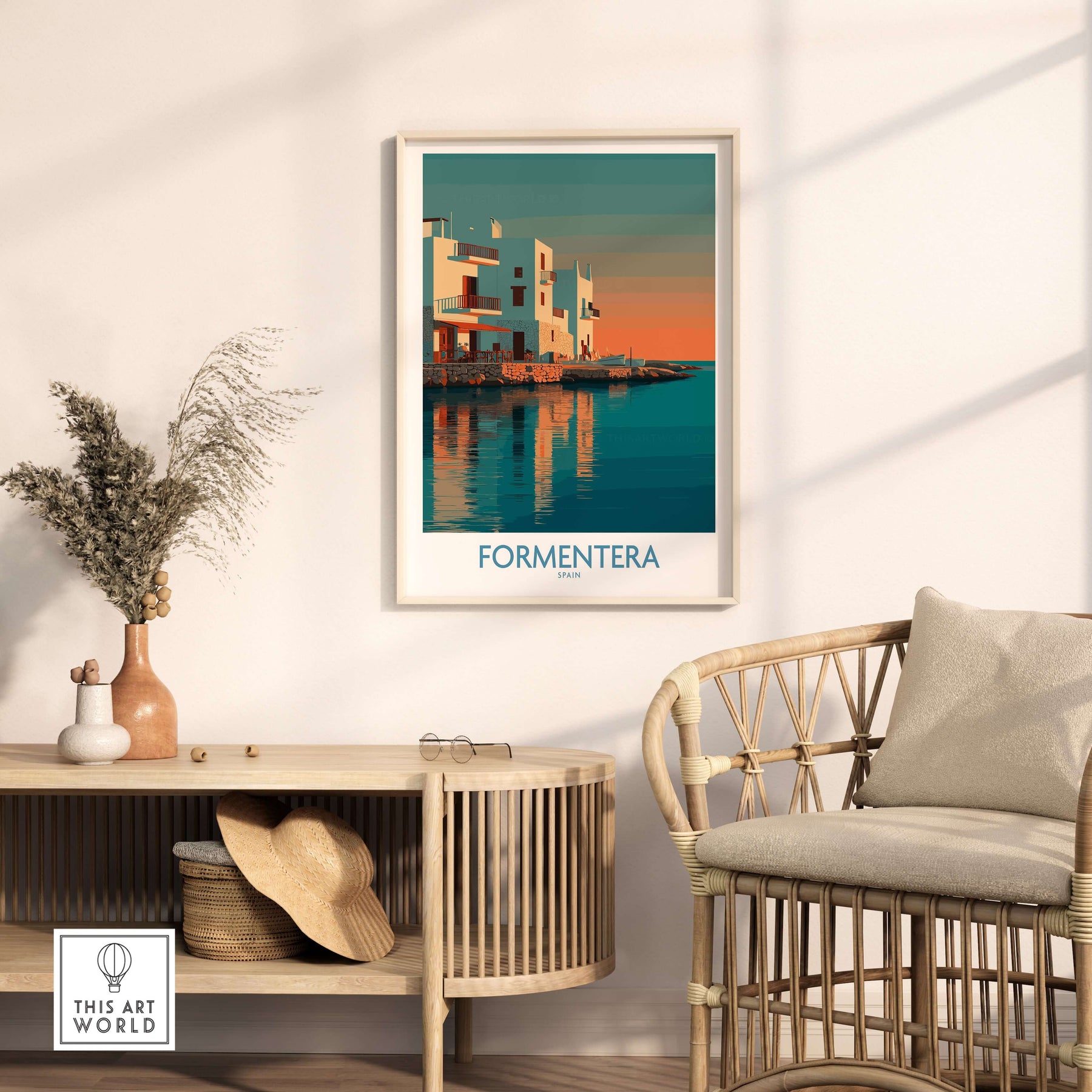 Formentera Spain Sunset White Houses Art Print | Balearic Island Poster displayed among other travel art prints.