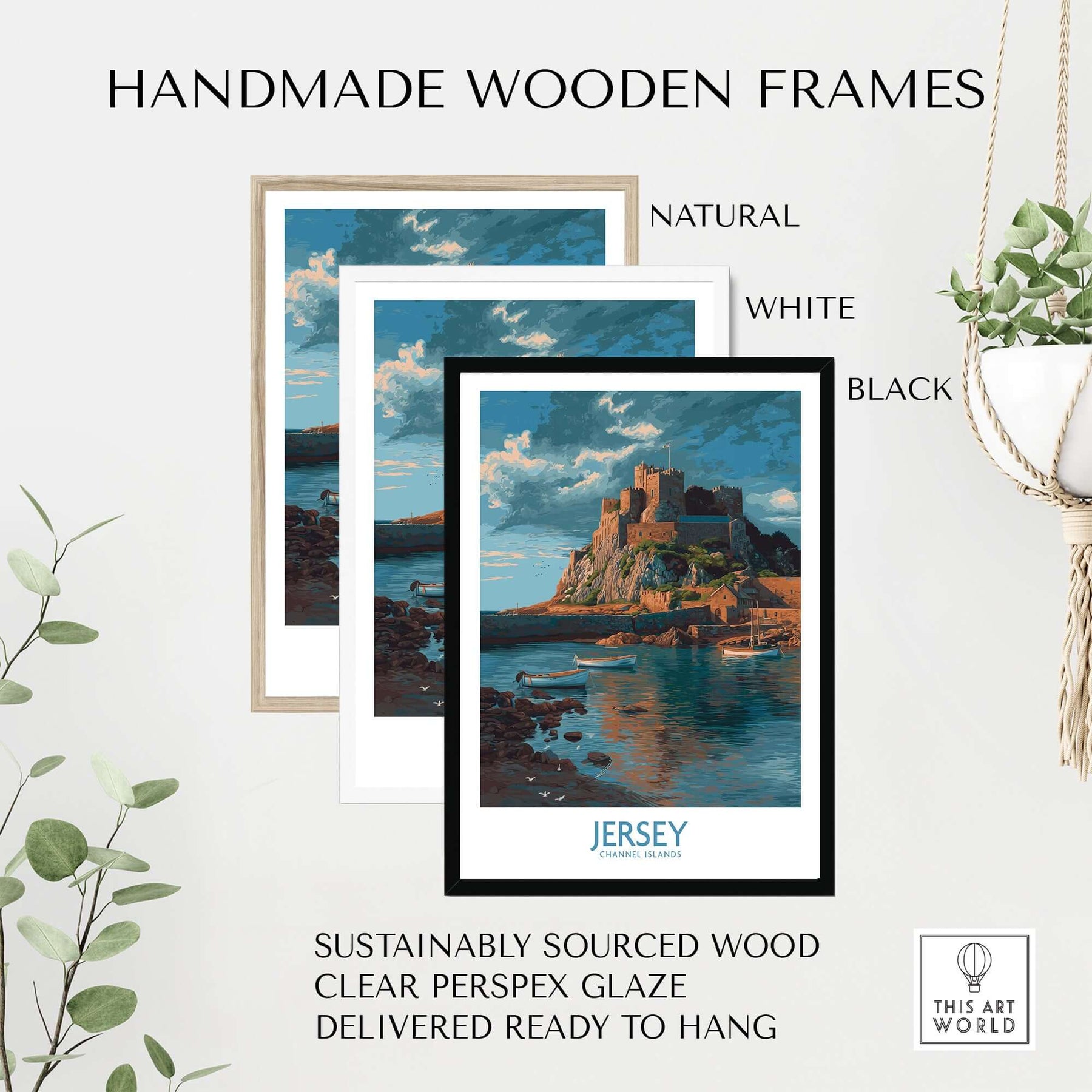 Jersey Channel Islands Art Print - Mont Orgueil Castle displayed in handmade wooden frames of natural, white, and black colors.
