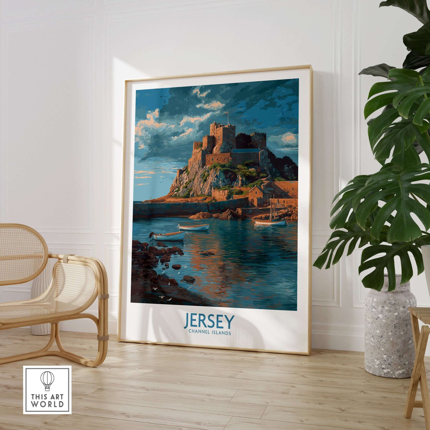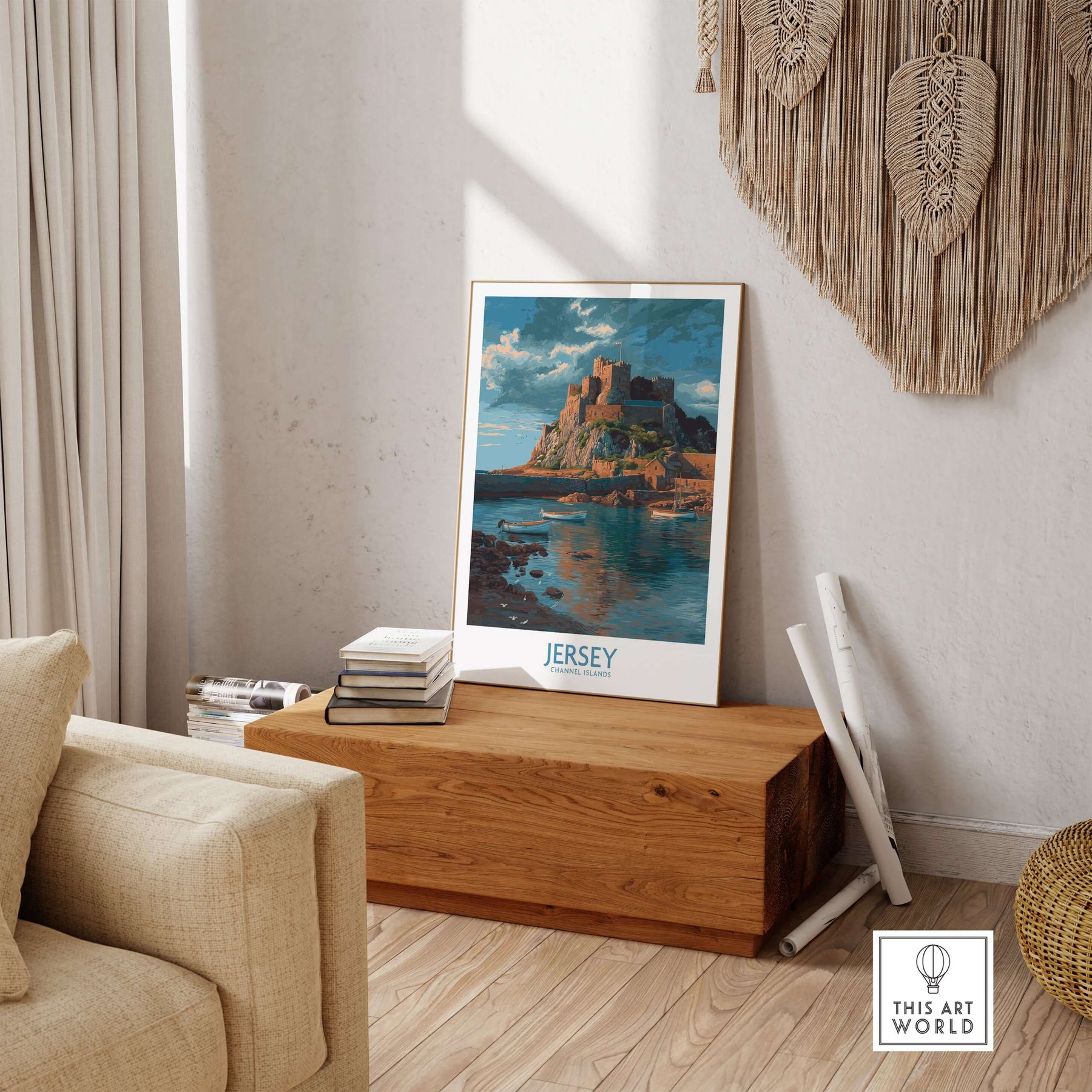 Jersey Channel Islands Art Print - Mont Orgueil Castle displayed in a stylish living room decor setting.