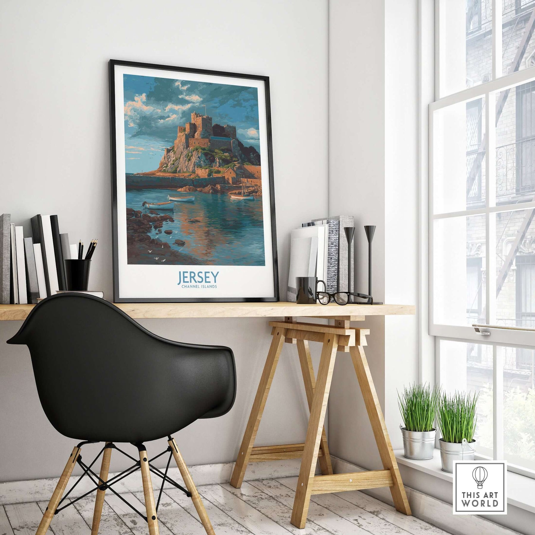 Jersey Channel Islands Art Print - Mont Orgueil Castle displayed in a modern workspace, highlighting the coastal view.