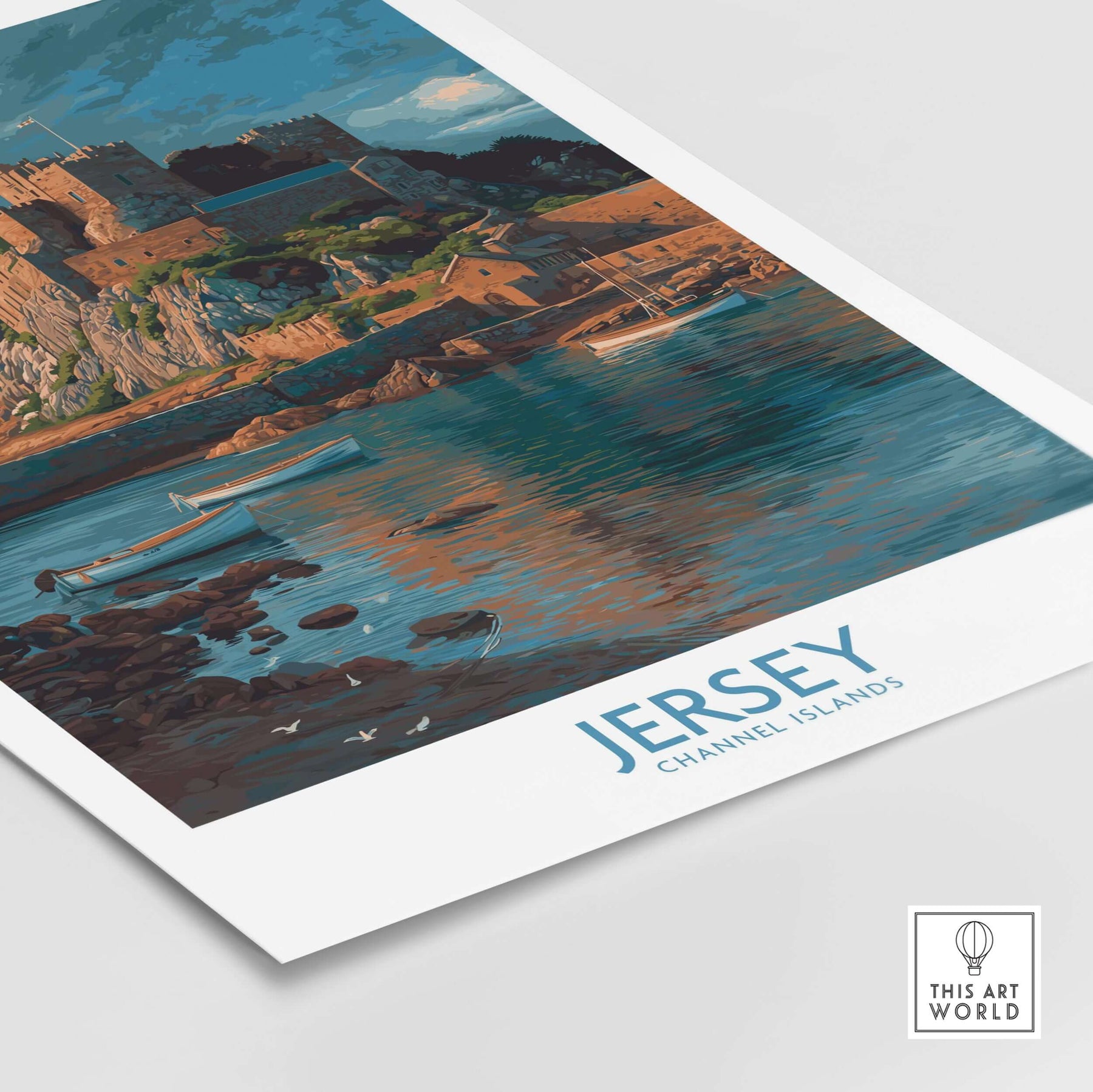 Jersey Channel Islands Art Print - Mont Orgueil Castle depicting the iconic fortress and coastal scenery.