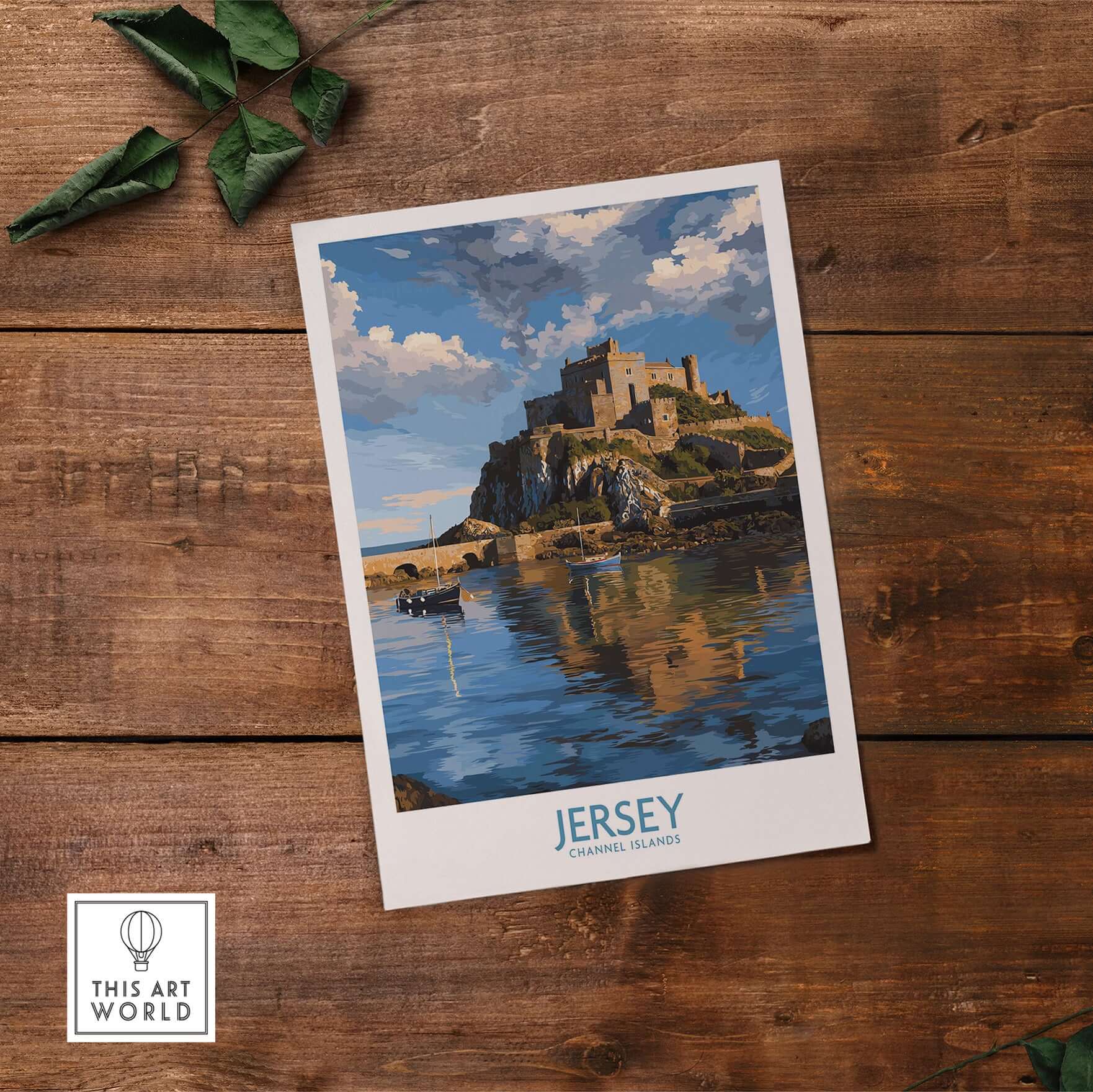 Jersey Channel Islands Mont Orgueil Castle Art Print | Historic Landmark Poster displayed on a wooden table by a window.