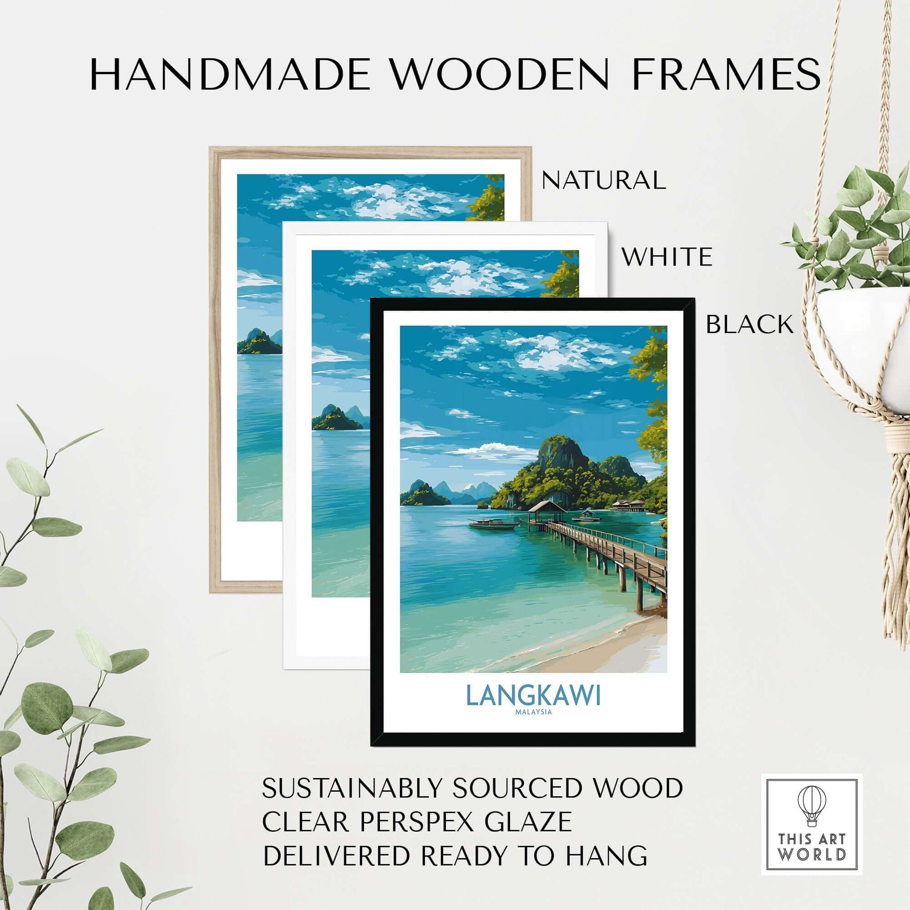 Langkawi Malaysia Art Print | Island Travel Poster displayed in handmade wooden frames in natural, white, and black.