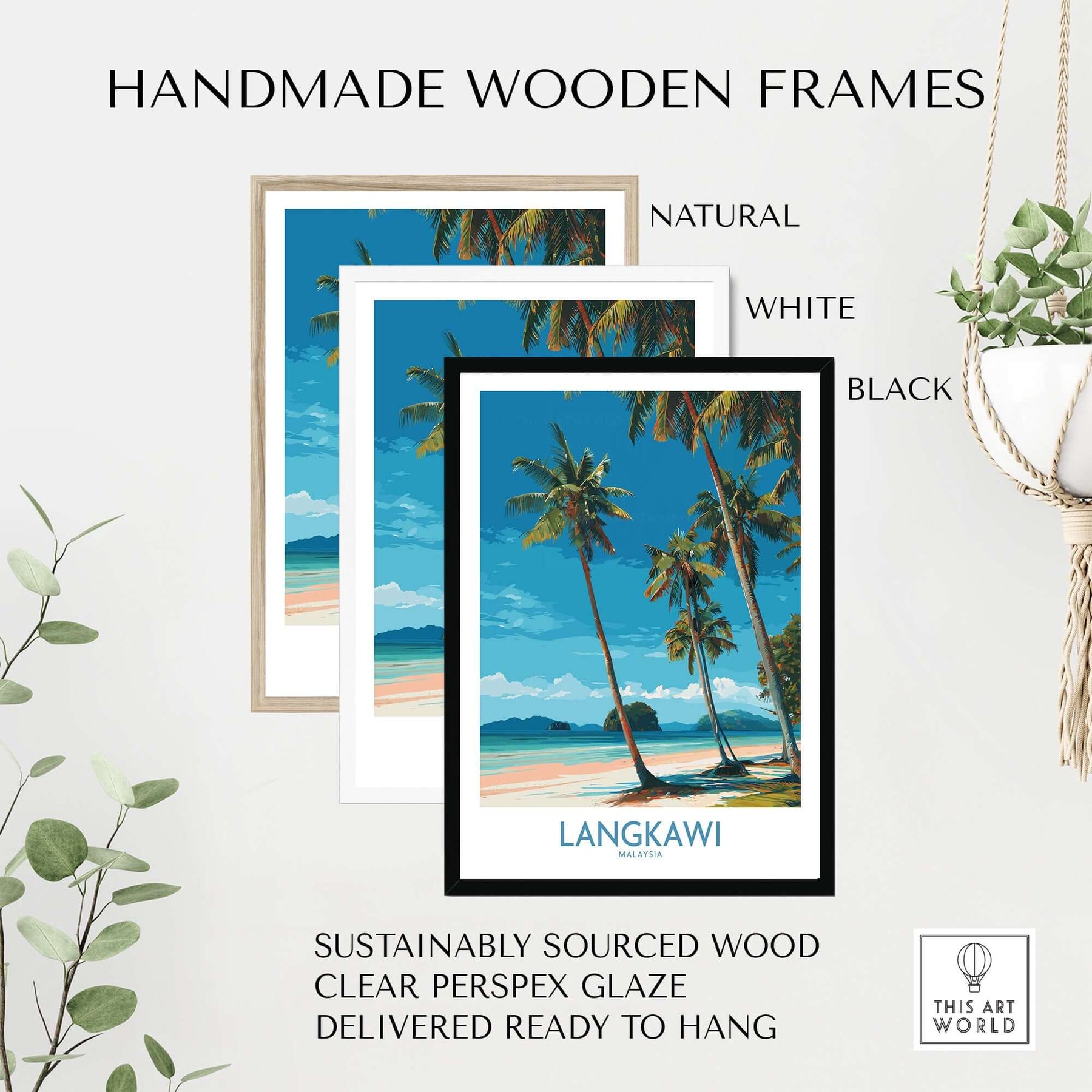 Langkawi Malaysia Print | White Sand Beach Poster displayed in handmade wooden frames of natural, white, and black finishes.