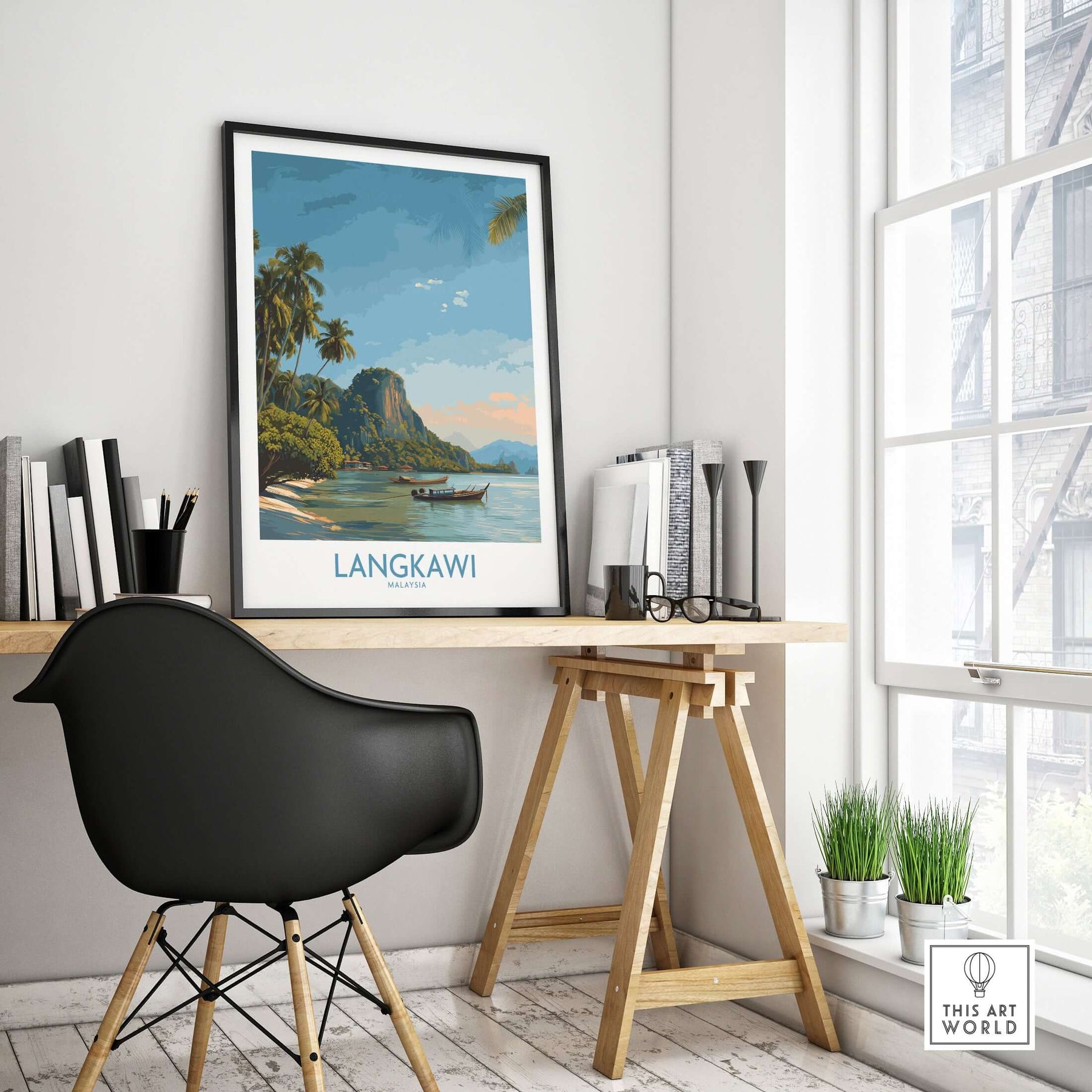 Langkawi Malaysia Tropical Beach Art Print | Longtail Boat Island Poster displayed in a modern workspace.